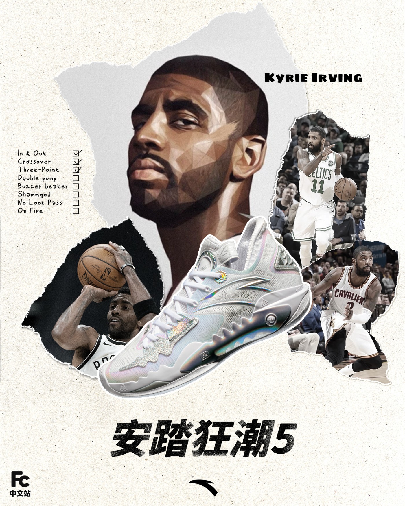 可以看到在安踏官宣的图片中,欧文分别上脚了狂潮 5 Pro 和狂潮 5 两双战靴。