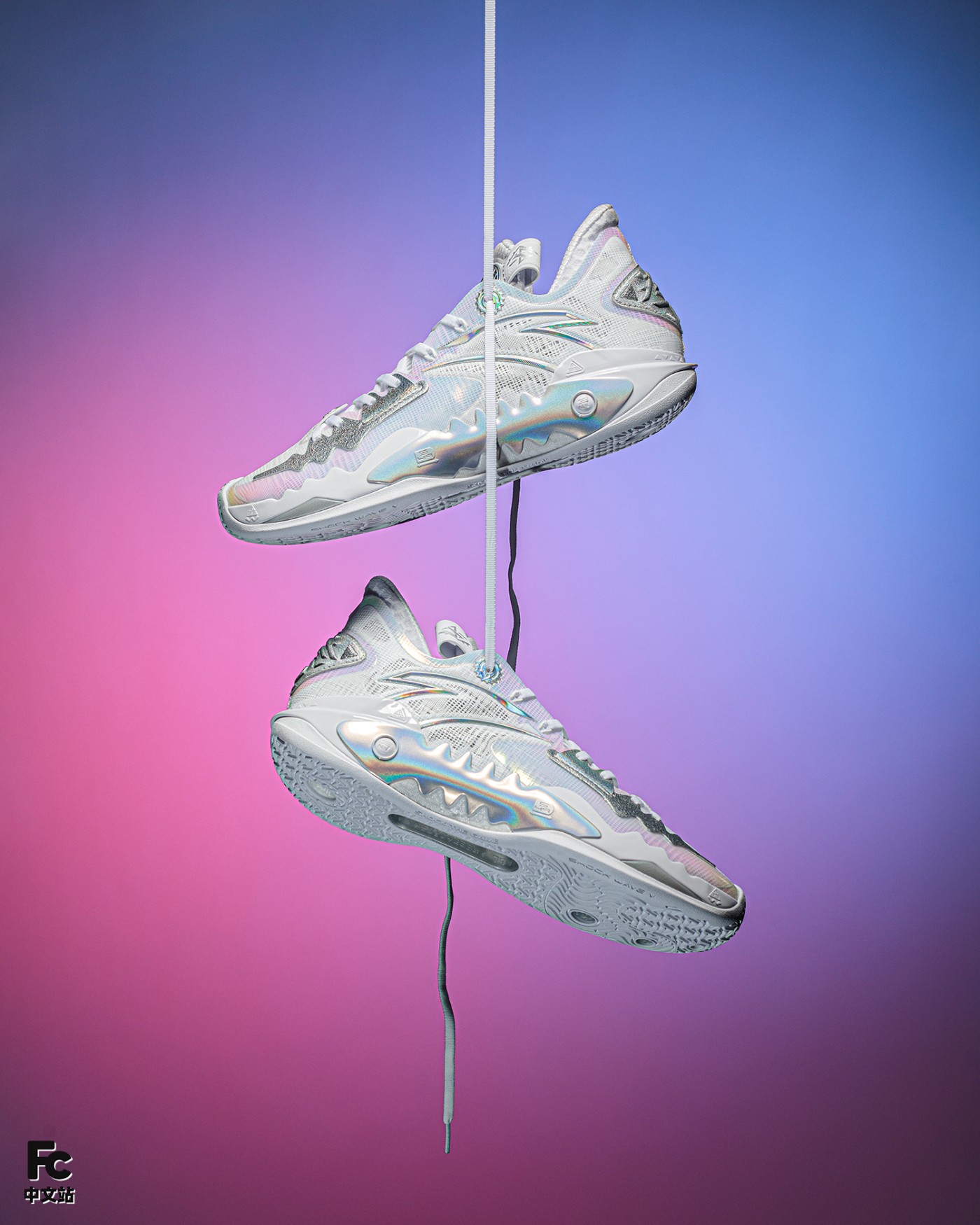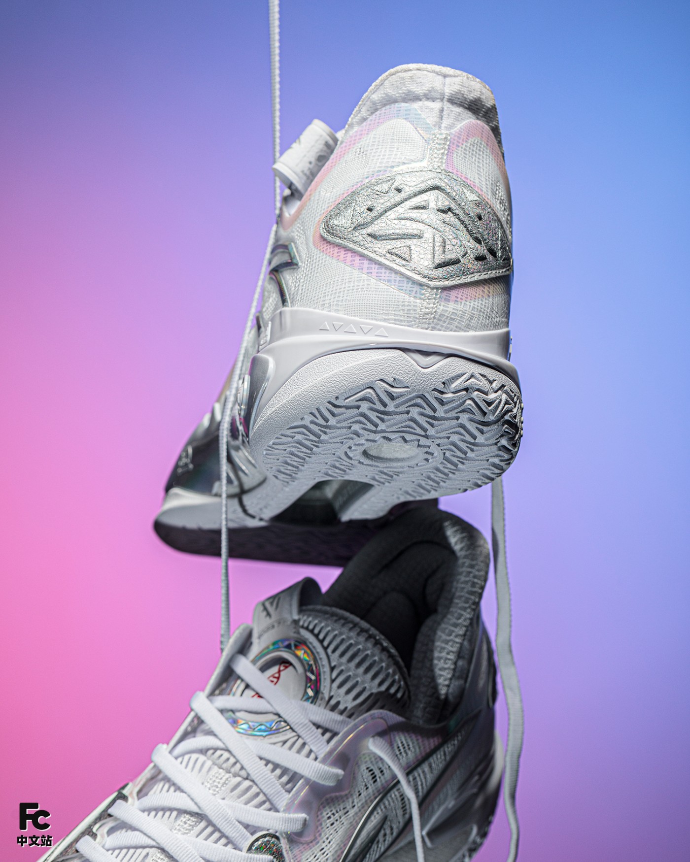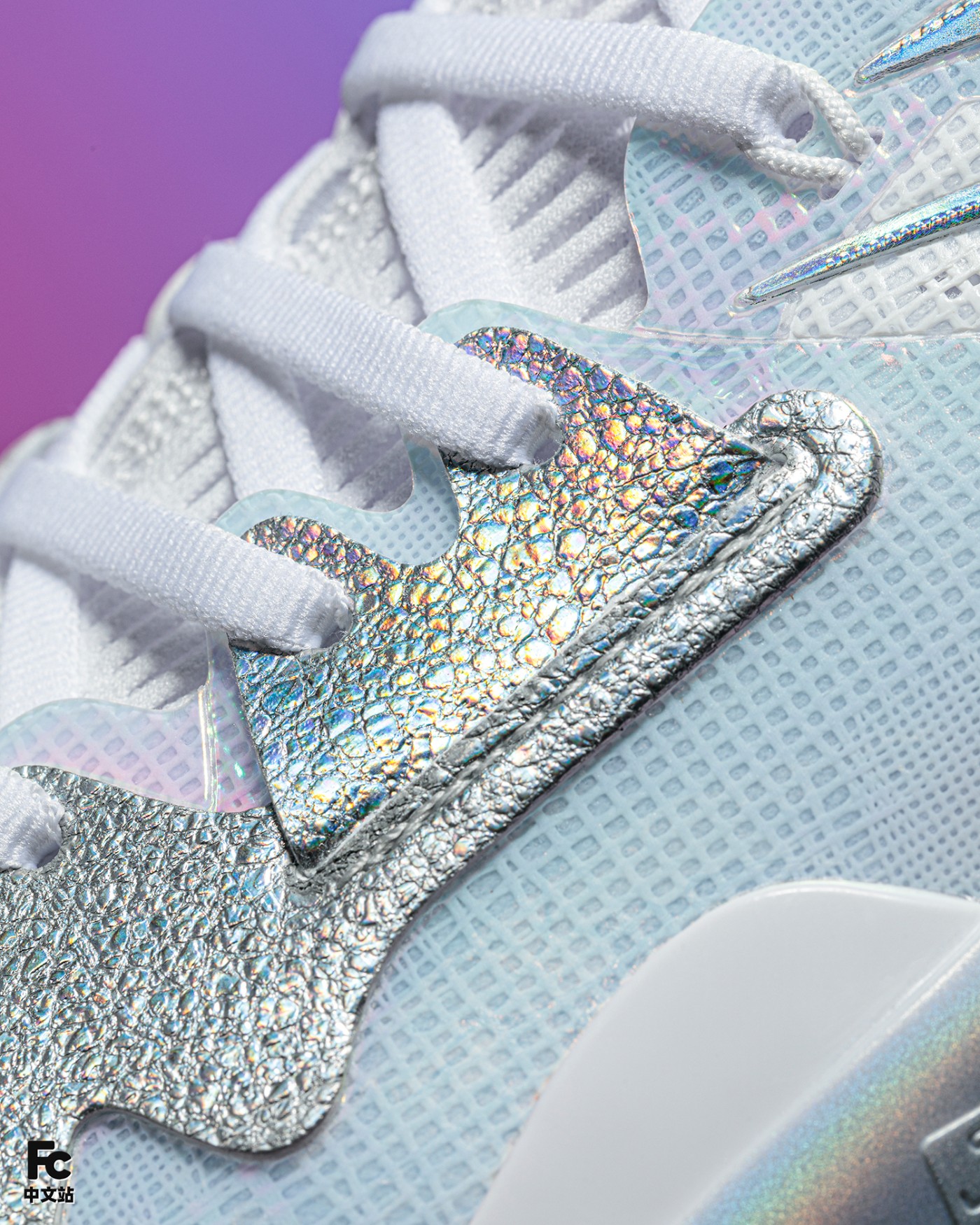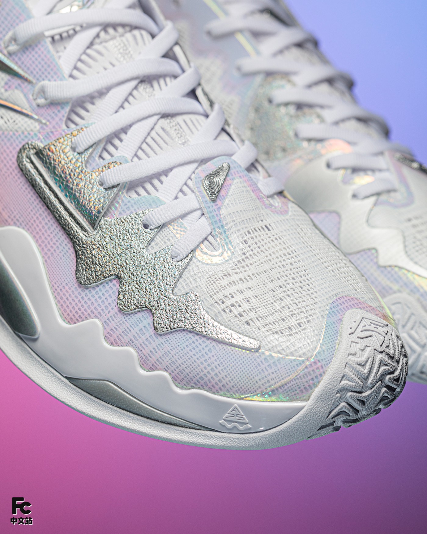 整双鞋采用大面积白和银色妆点,辅以炫彩装饰点缀,呈现出绚烂夺目的视觉效果。