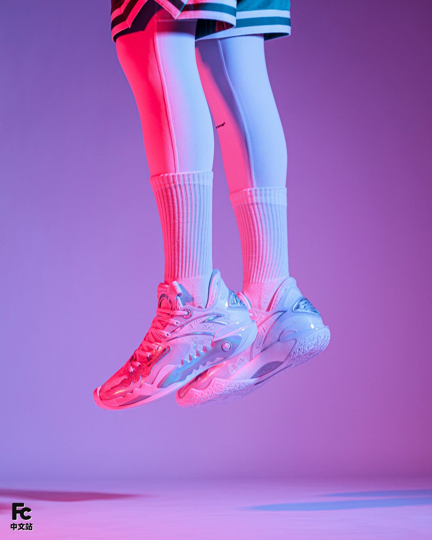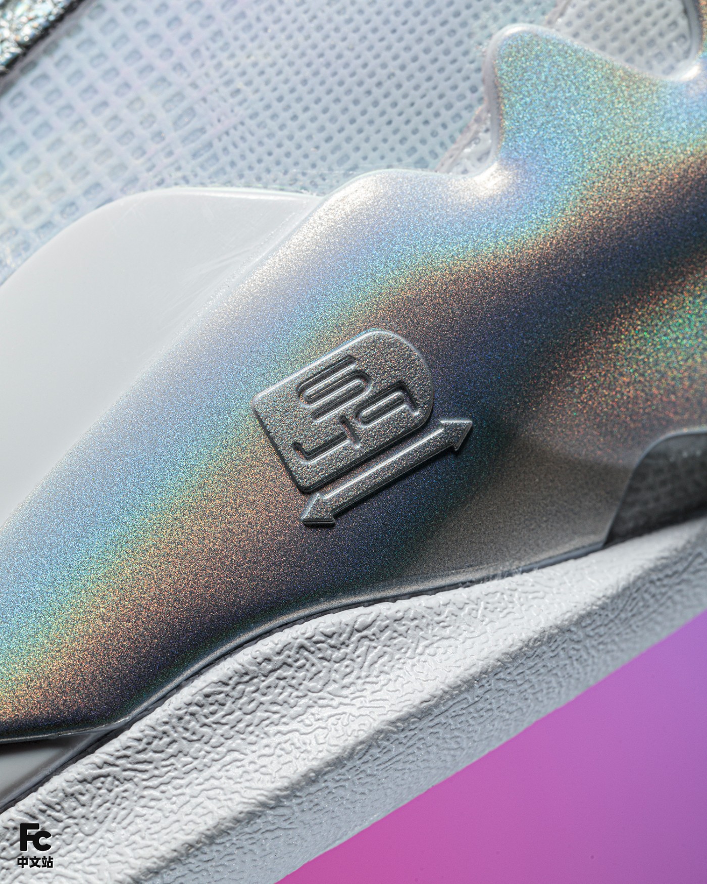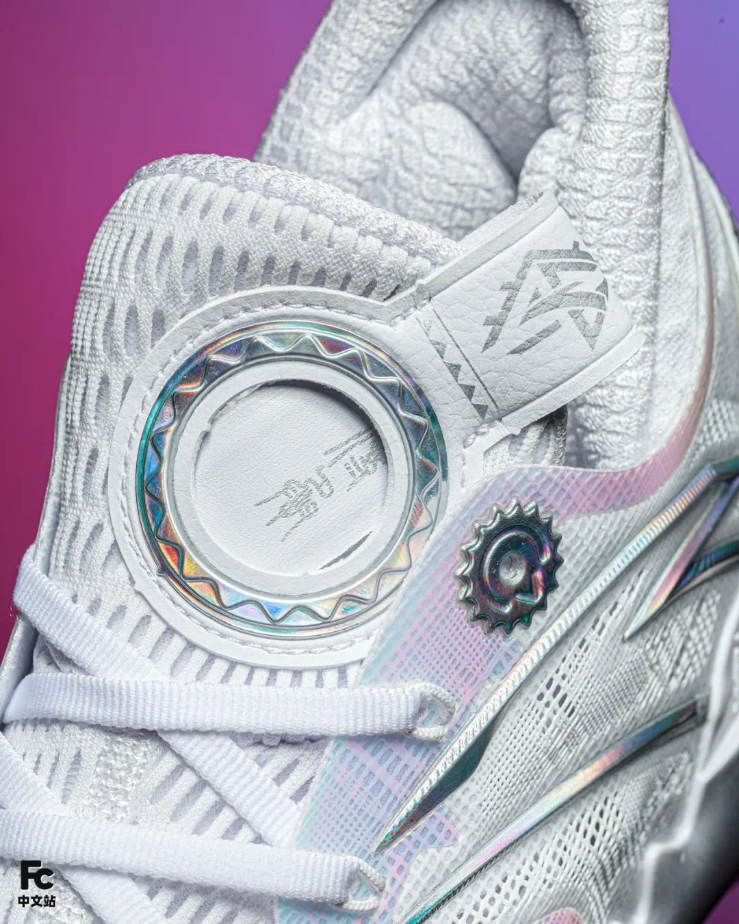 整双鞋采用大面积白和银色妆点,辅以炫彩装饰点缀,呈现出绚烂夺目的视觉效果。