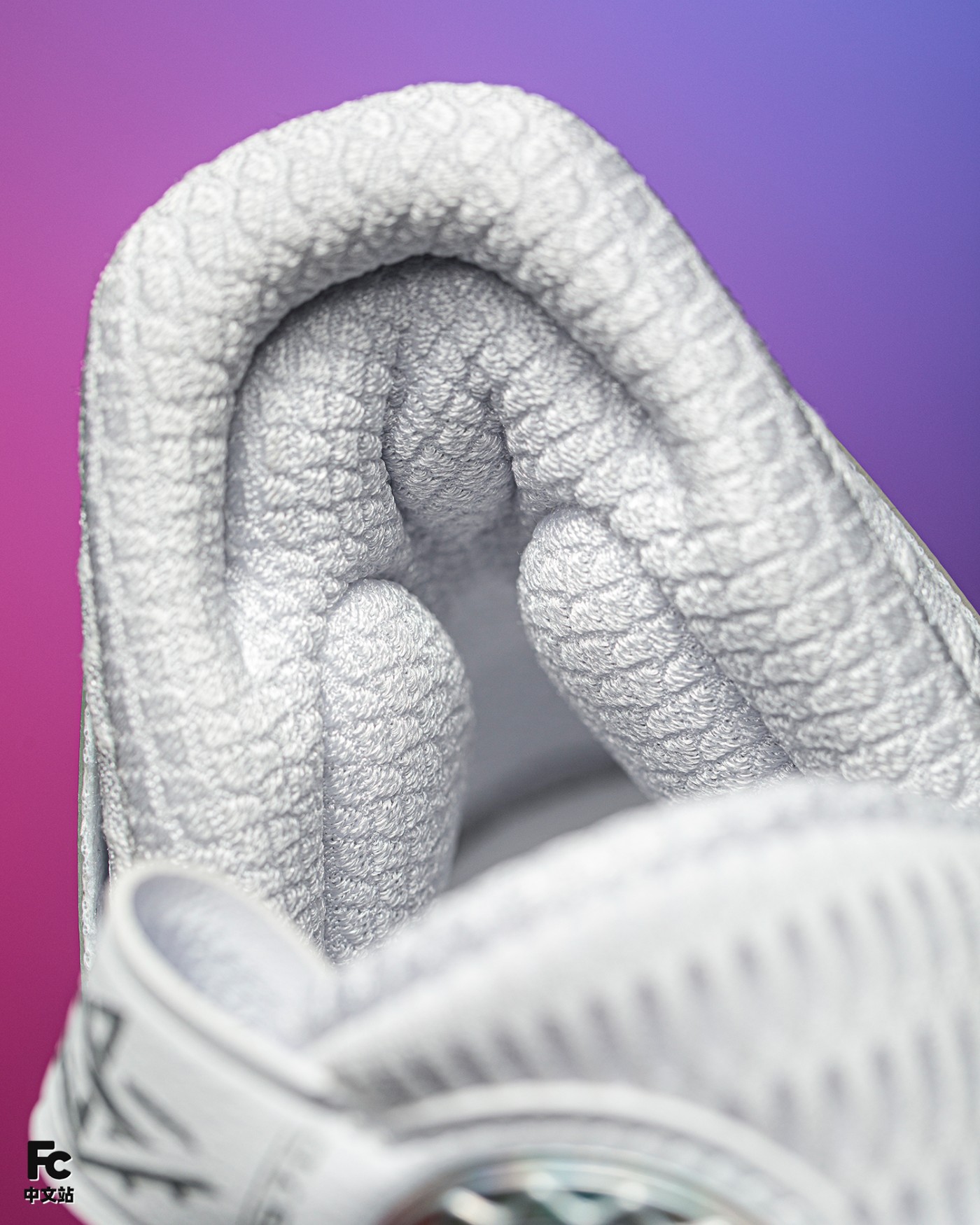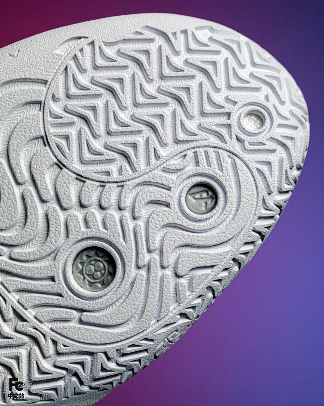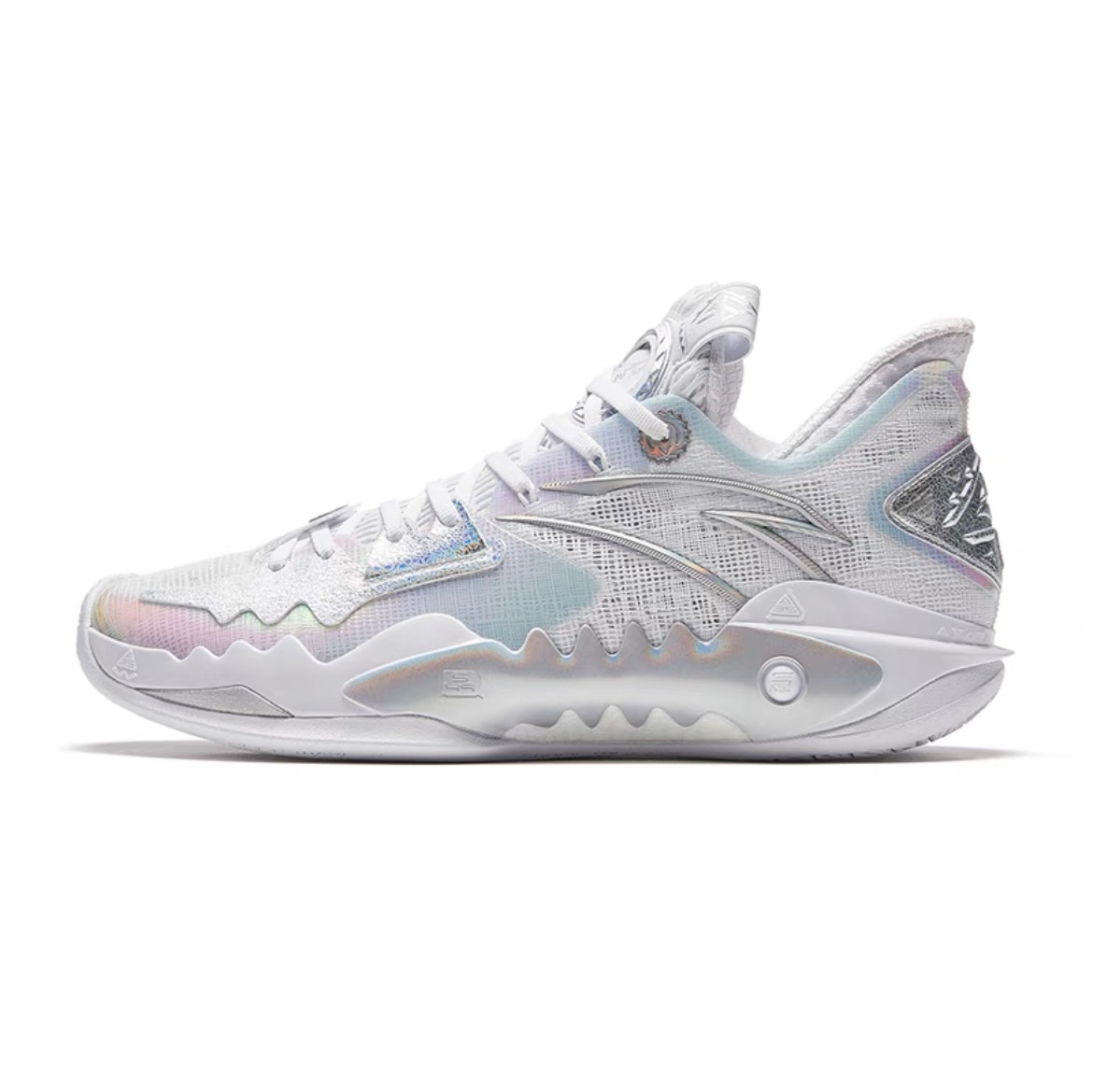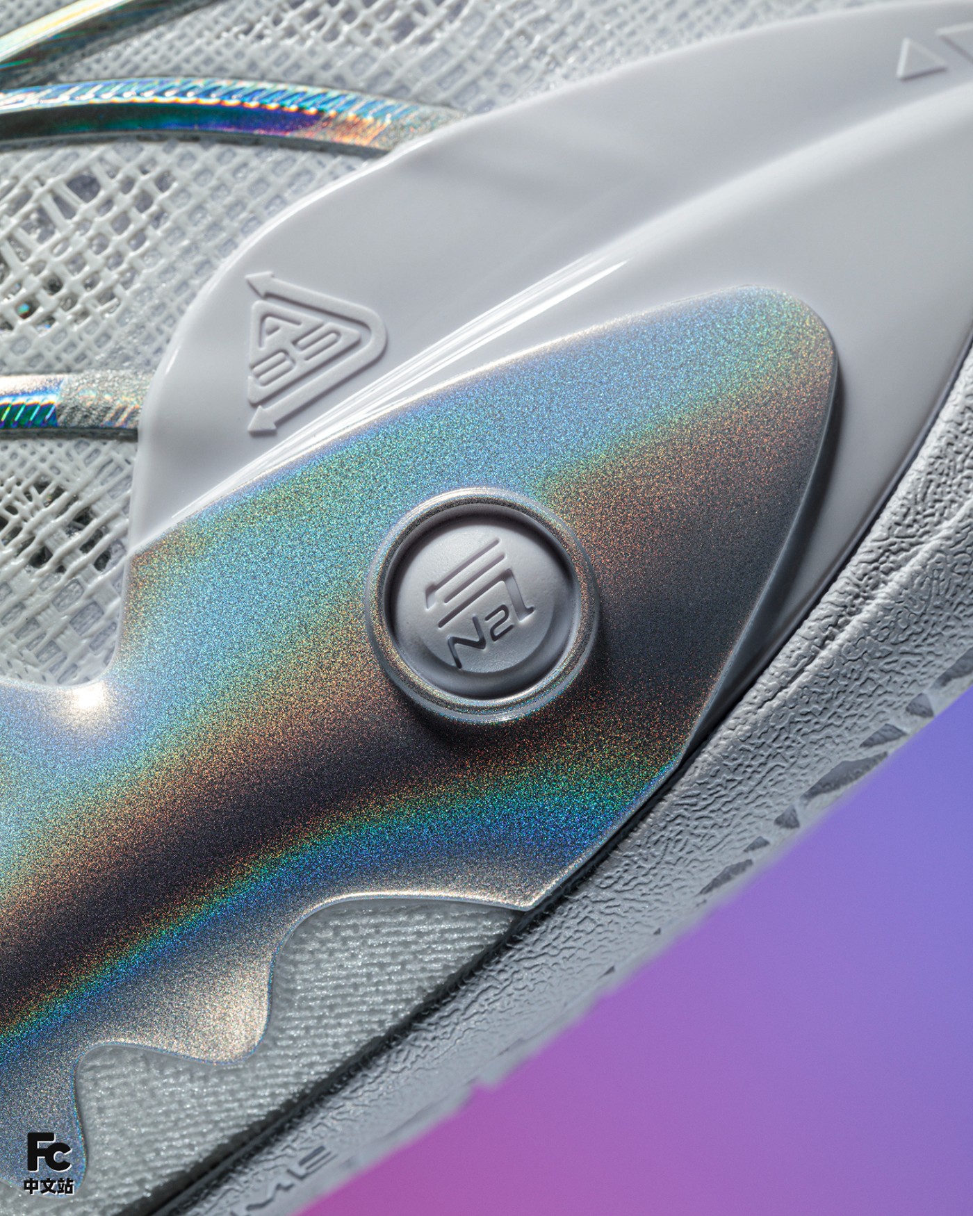 整双鞋采用大面积白和银色妆点,辅以炫彩装饰点缀,呈现出绚烂夺目的视觉效果。