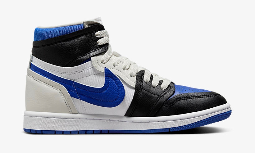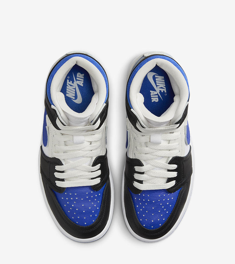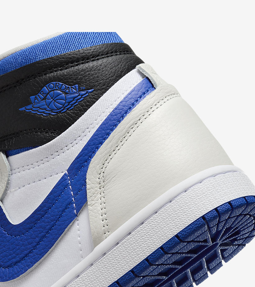 整双鞋采用黑、白、蓝三色搭配,配色方案的确有着不小的「大闪电 AJ1」既视感。