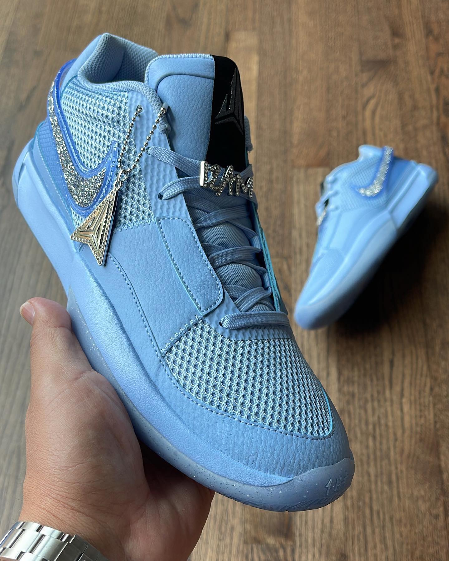 鞋侧面 Swoosh 和鞋绳挂件均采用施华洛世奇的 “钻石” 打造,尽显奢华气质。