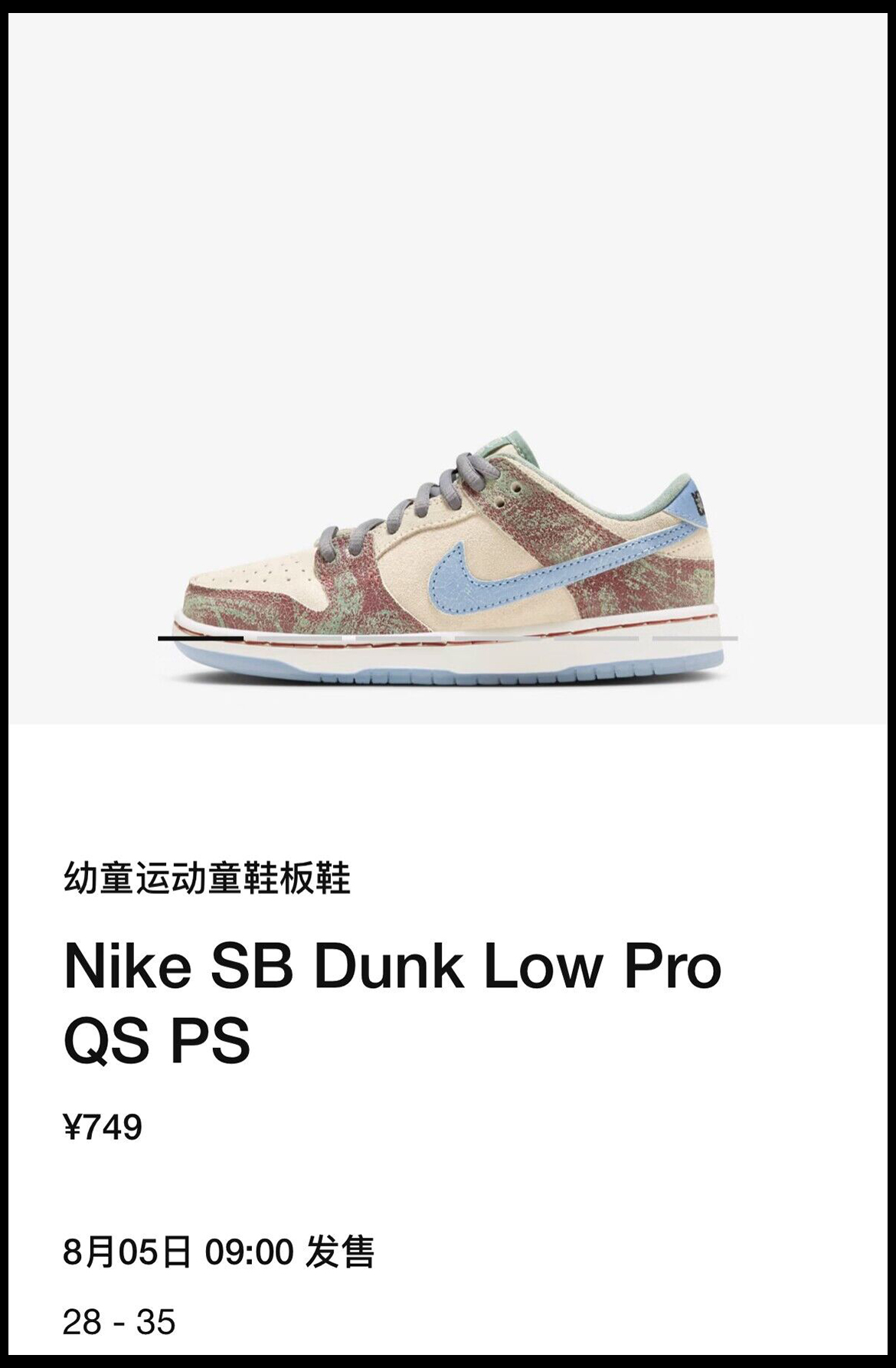 近日一款颜值极高的 Crenshaw Skate Club x Nike SB Dunk Low 正式上架 SNKRS 中国 APP,将于 8 月 5 日明天登场,目前仅上架了幼童和婴童版,相信成人版很快就会登场,大家可以期待一下!