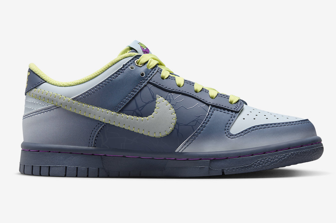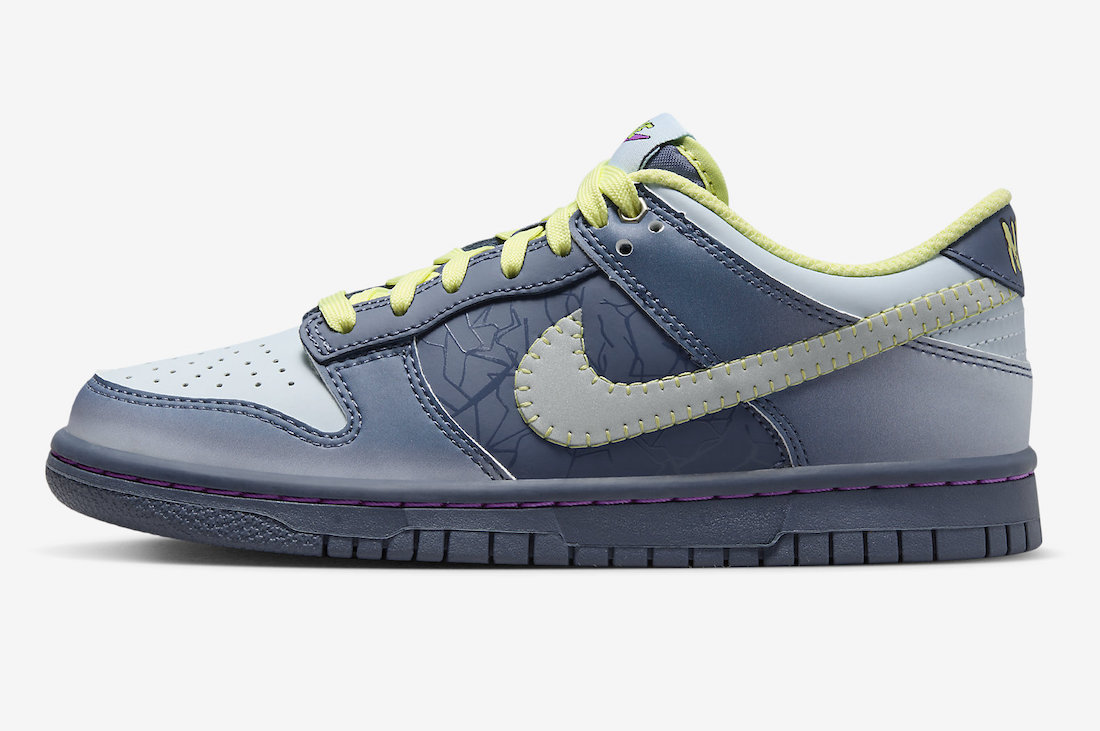 整双鞋采用大面积深蓝色覆面,淡蓝和绿色点缀,呈现出浓郁的万圣节节日氛围。