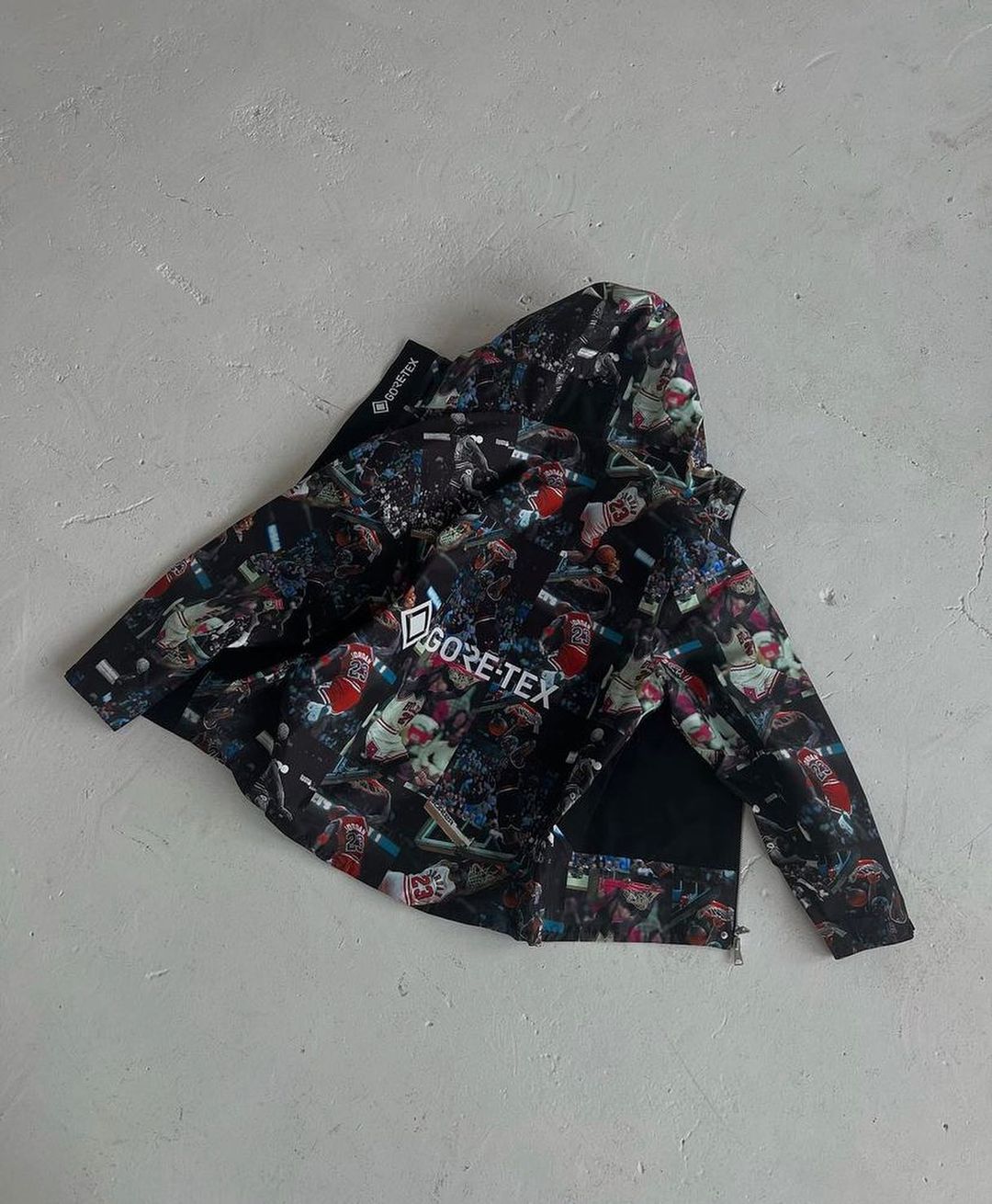 整件衣服在版型上与普通冲锋衣没有太大差别,但花纹却是以满印乔丹赛场「名场面」打造,造型花哨却不杂乱,视觉效果格外讨喜。