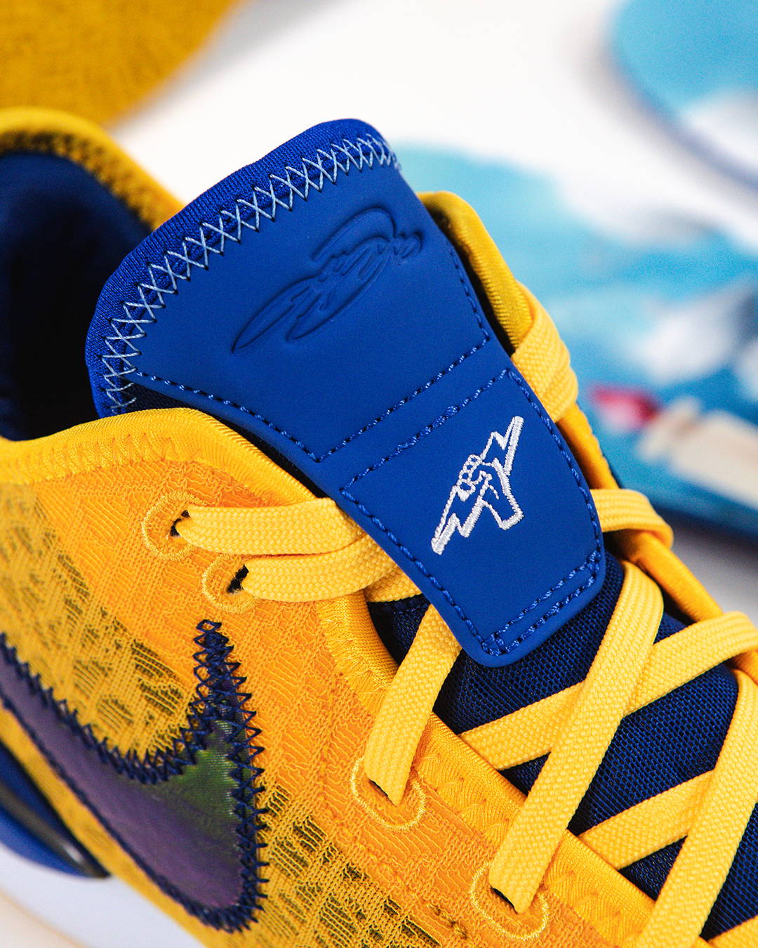整双鞋采用大面积黄色覆面,蓝色点缀,十分亮眼夺目。