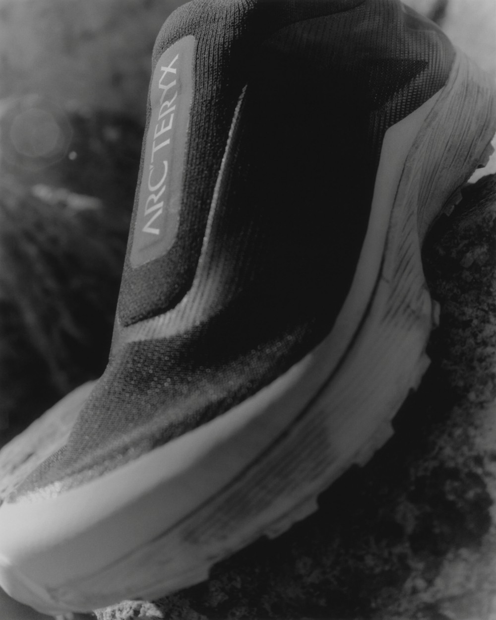 采用无鞋带的一体式设计,鞋舌位置始祖鸟英文 Logo 凸显身份,同时增加整双鞋的层次感。