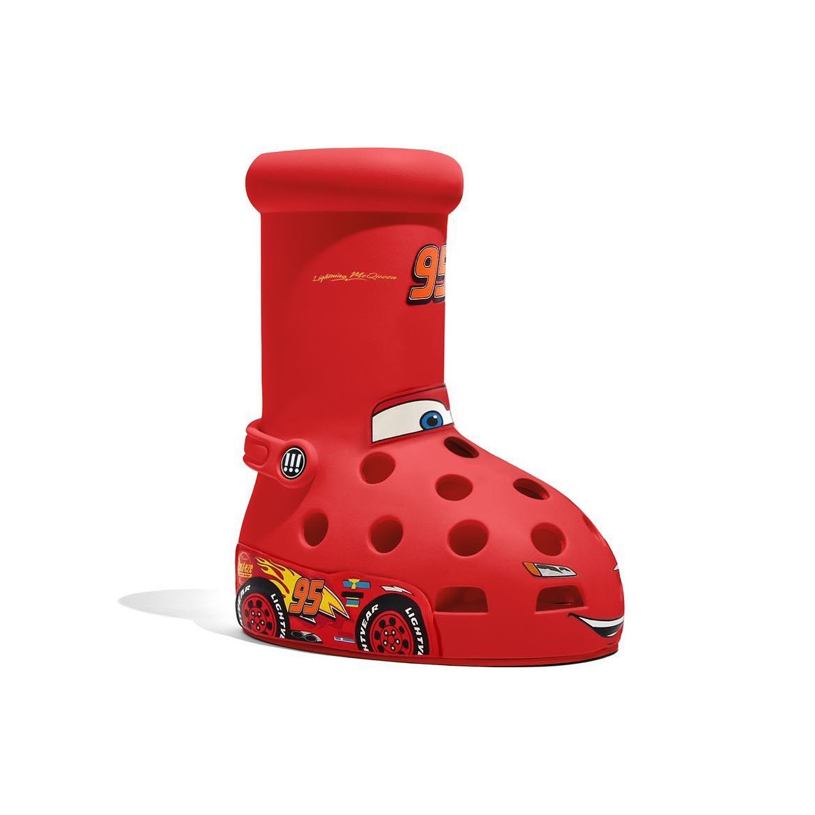 作为 Crocs 的联名款,鞋面位置还原了标志性洞洞鞋设计,后跟部分额外添加了绑带元素。