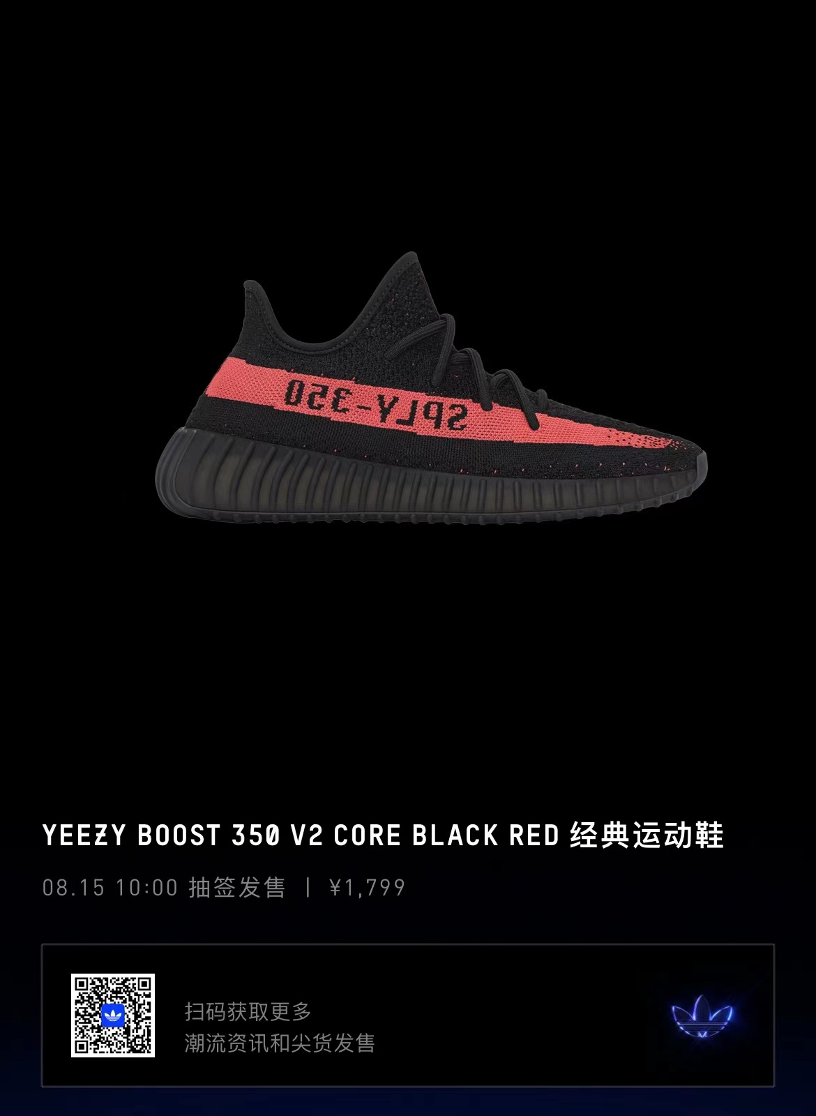 目前 Yeezy Boost 350 V2 “Core Black Red” 已于今早 10:00 在 CONFIRMED APP 已开启登记,登记将会在 8 月 15 日上午 9:30 截止,并于当天 10:00 正式开启抽签。