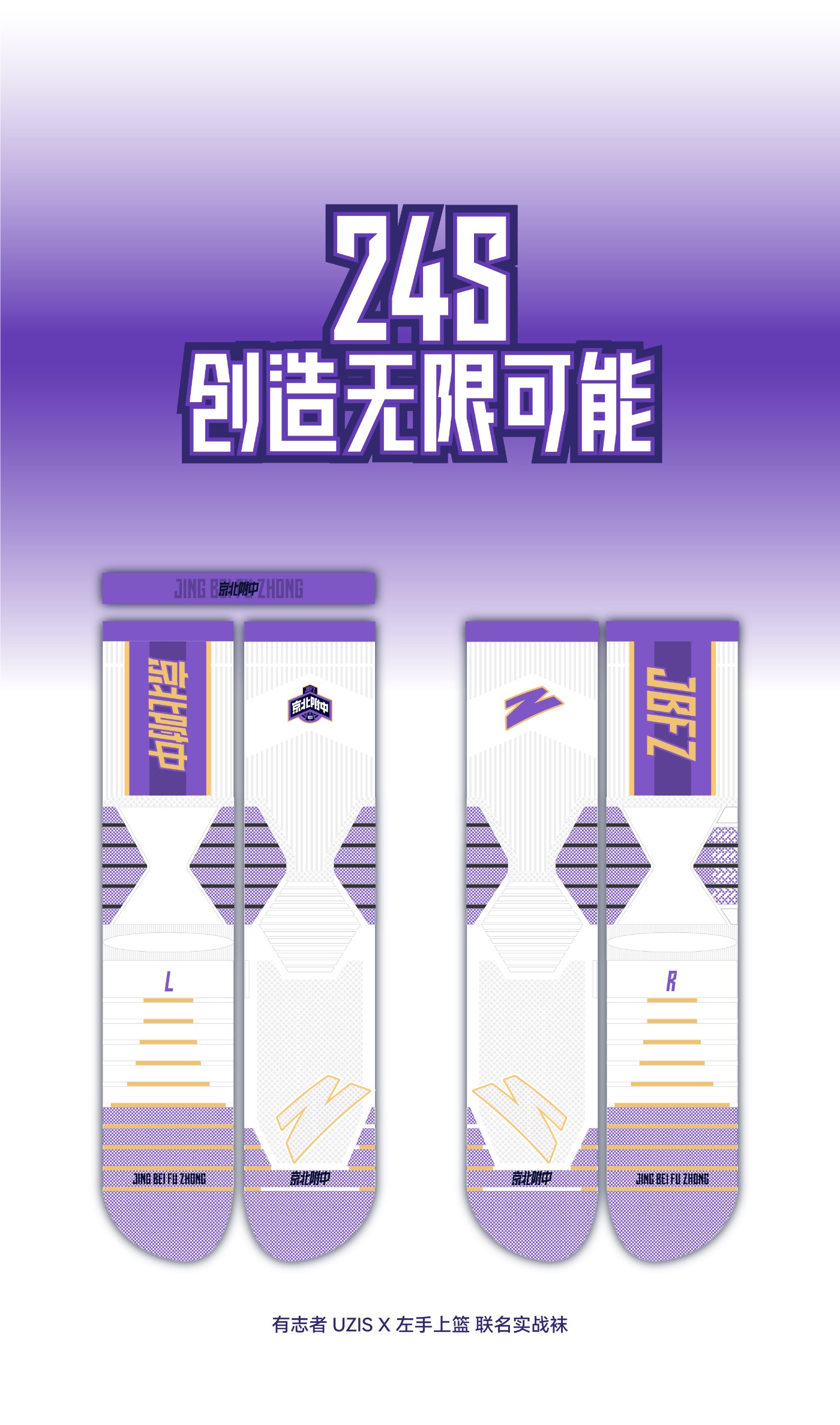 此外,「有志者 UZIS」还特别推出了一双联名款实战篮球袜,白紫相间的配色让穿搭更加多样化。