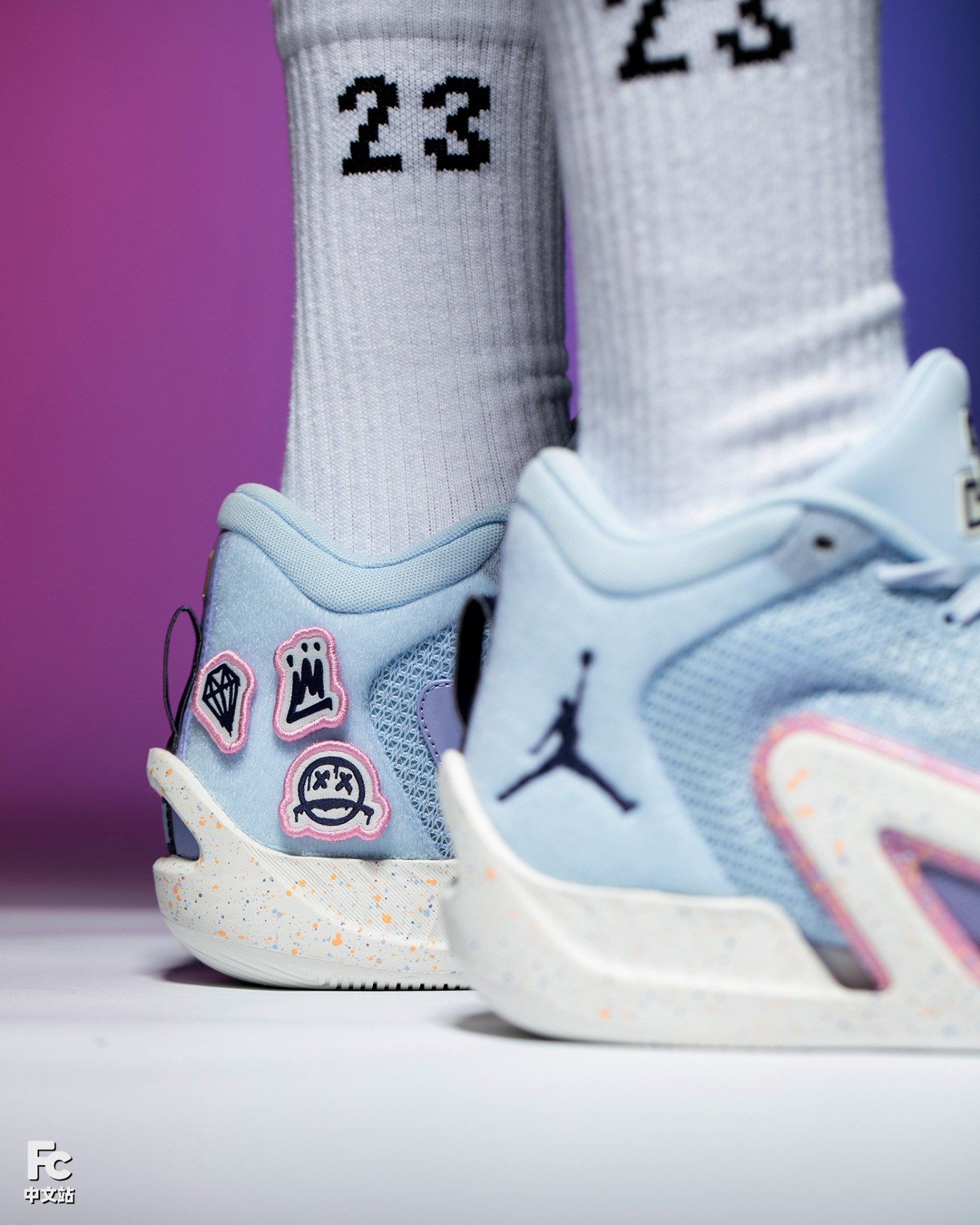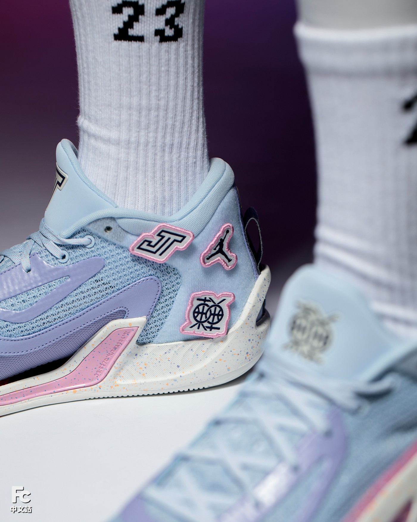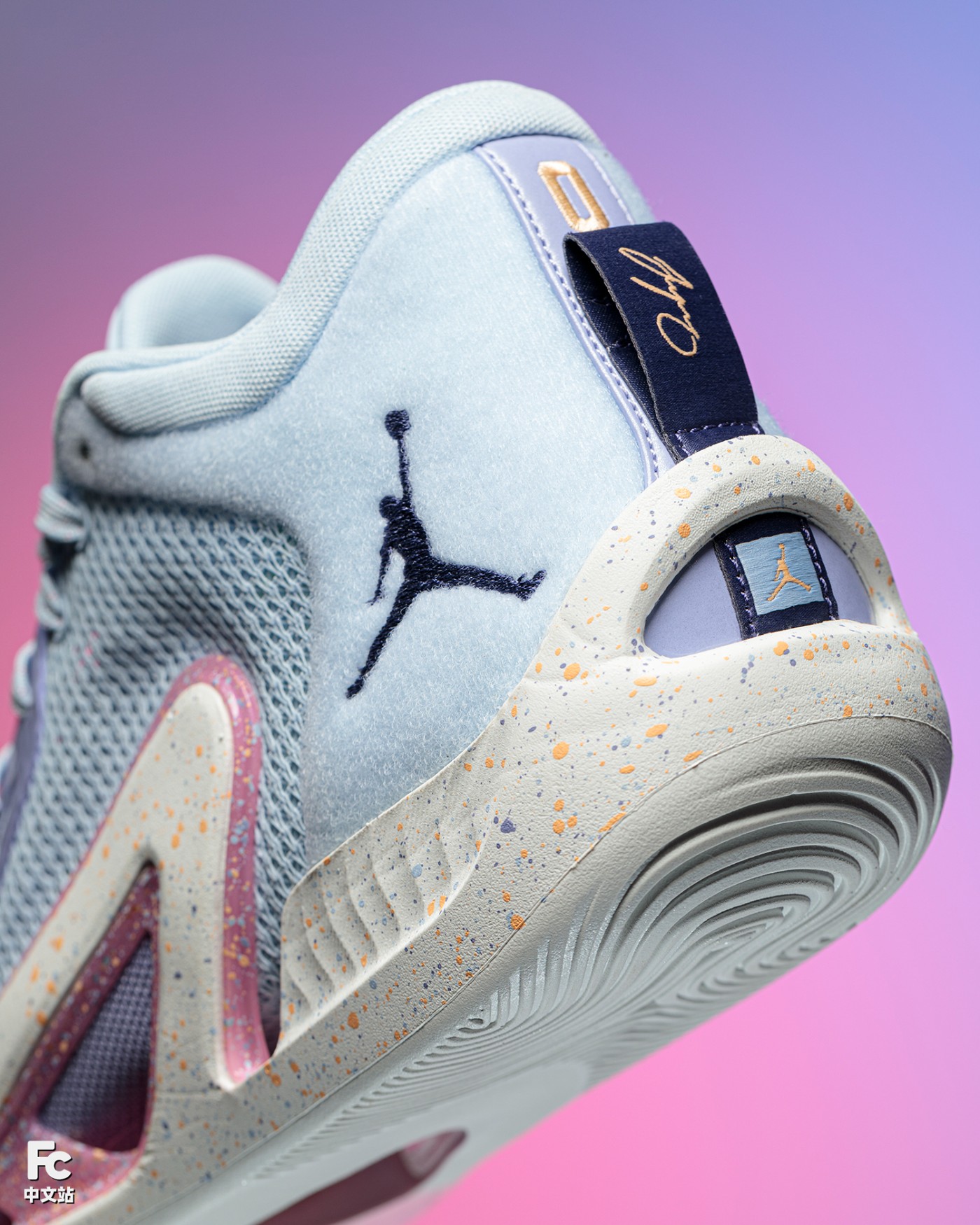 中底部分,Jordan Tatum 1 的创新镂空框架和白色中底,增添闪粉、泼墨细节。