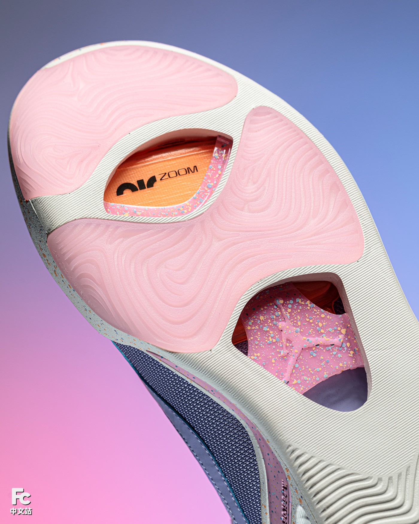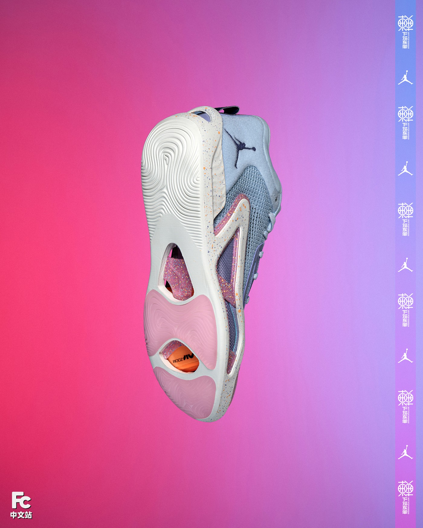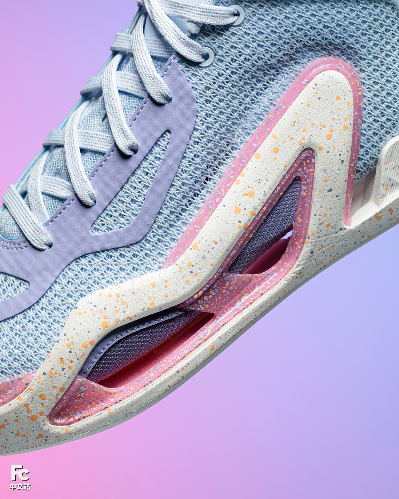 中底部分,Jordan Tatum 1 的创新镂空框架和白色中底,增添闪粉、泼墨细节。