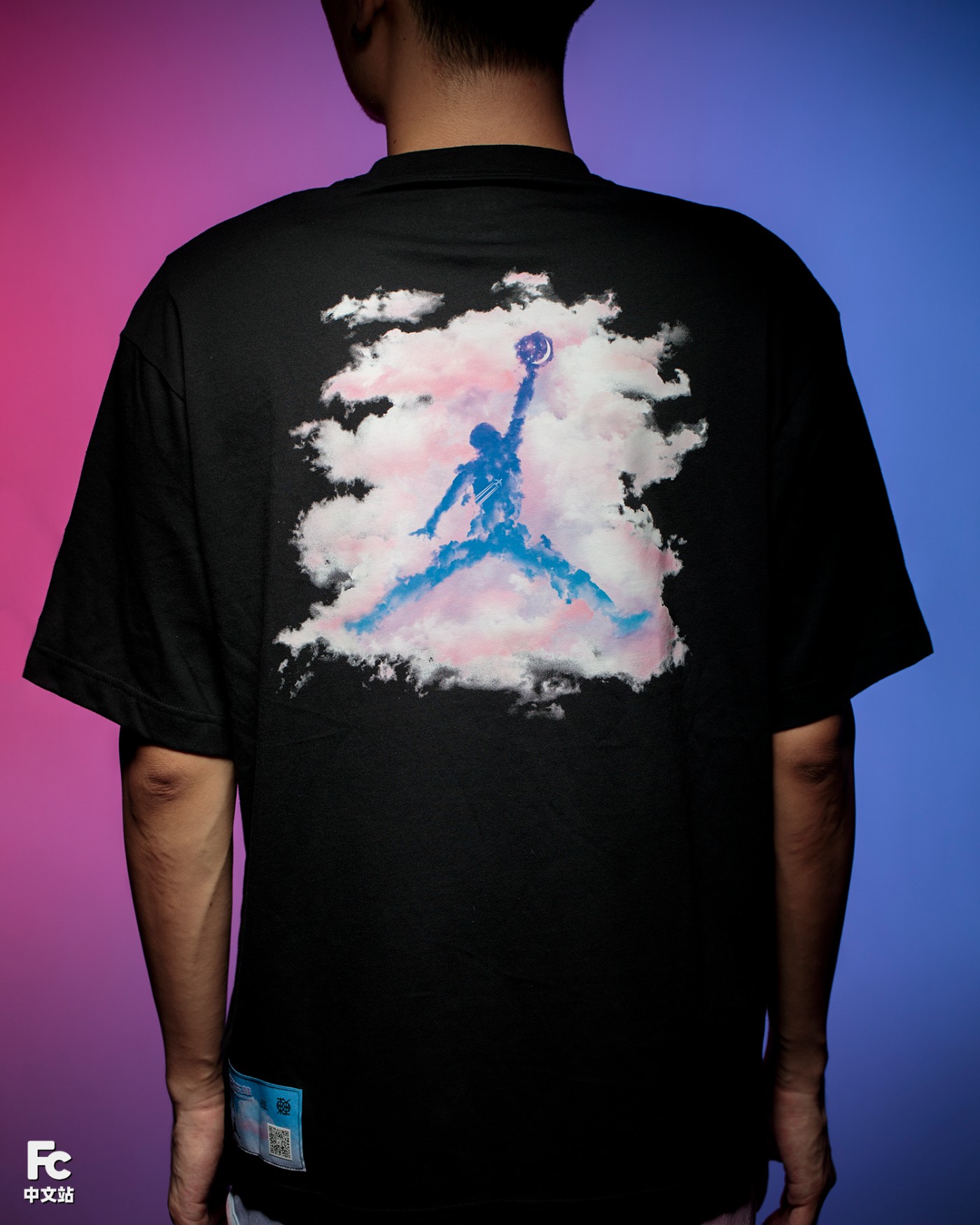 T恤背后晚霞衬托的蓝天 Jumpman Logo,细看手上篮球幻化成月光,胸前还有飞机穿过。