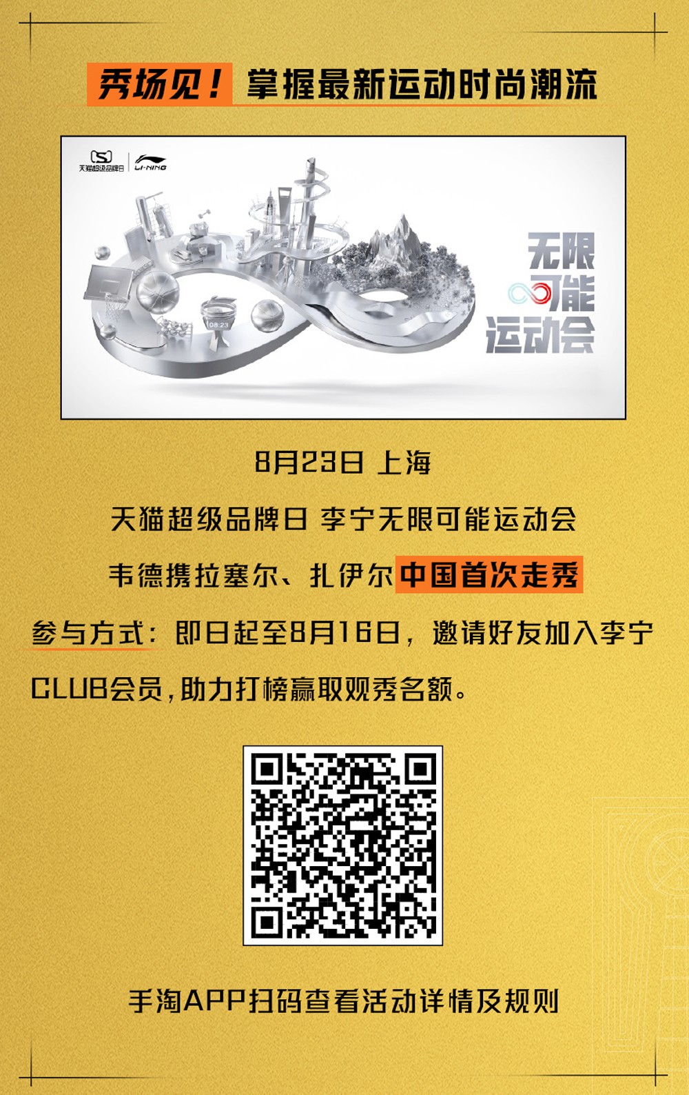 活动细节依次为 8 月 23 日在上海举办「李宁无限可能运动会」韦德将携手拉塞尔、扎伊尔·韦德出席,并进行中国首次走秀。