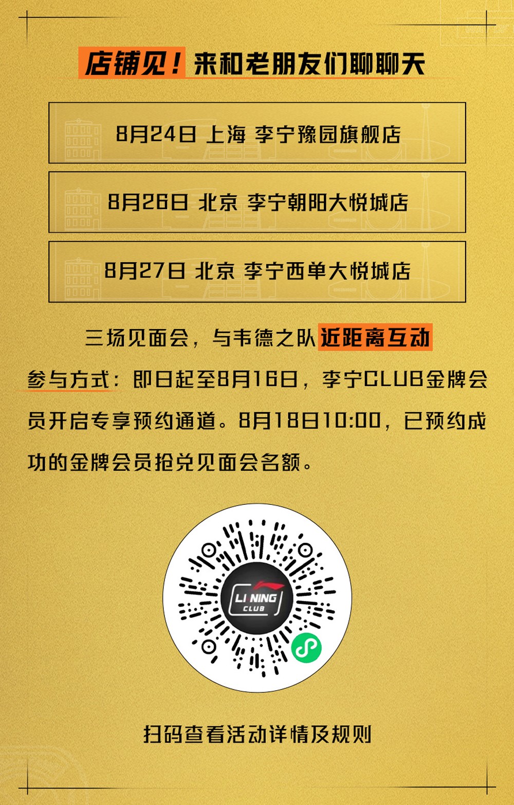 参与方式为即日起至 8 月16 日,李宁 CLUB 金牌会员开启专享预约通道,8 月 18 日10:00,已预约成功的金牌会员抢兑见面会名额,想要参与的小伙伴们不妨抓紧扫描下方小程序二维码行动起来!