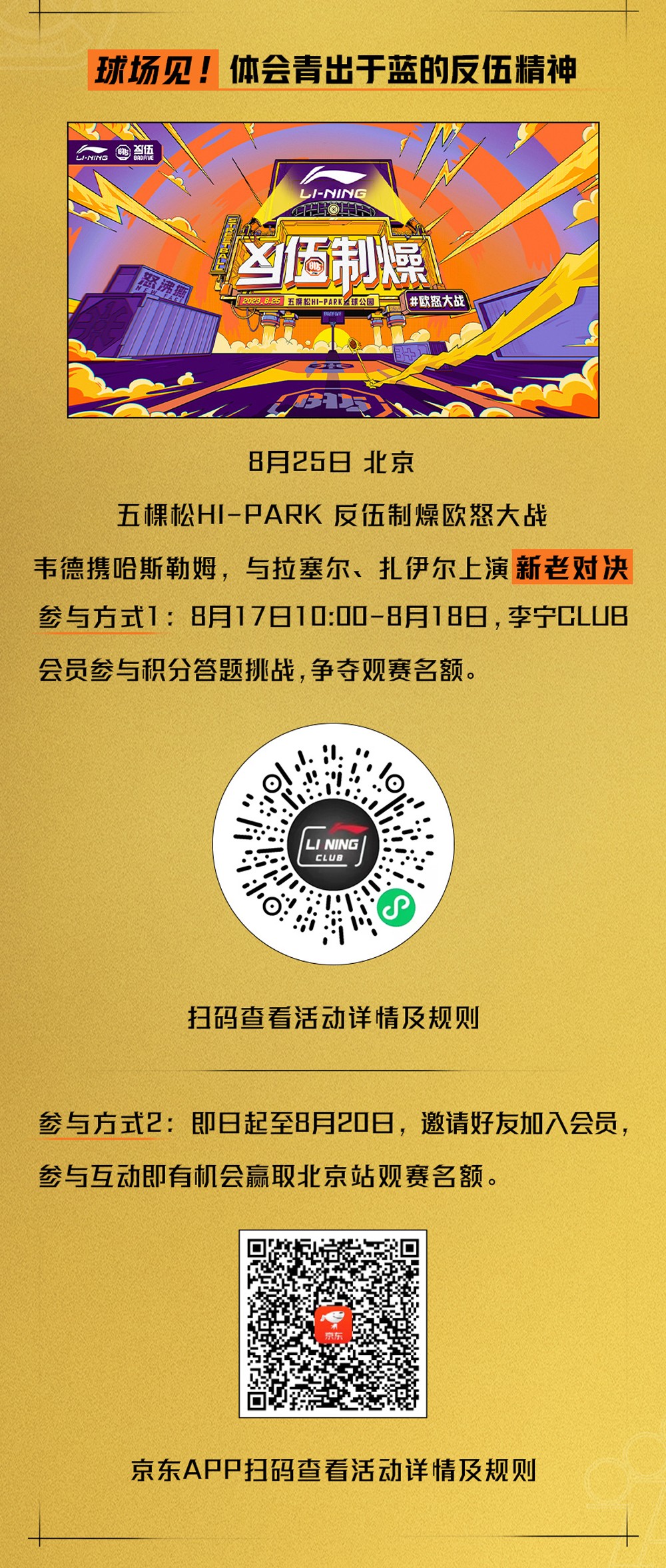 8 月 25 日,「韦德之队」会在五棵松 HI-PARK 举办「反伍制燥欧怒大战」,韦德会携手其他三名成员上演新老对决。
