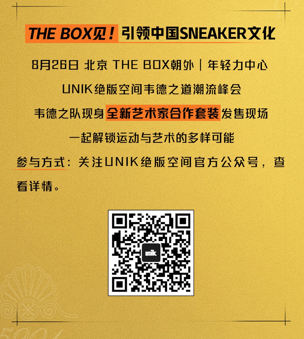 最后还将在 8 月 26 日于北京的 THE BOX 朝外 I 年轻力中心,UNIK 绝版空间韦德之道潮流峰会,届时除了「韦德之队」外,还将会有全新艺术家合作套装发售,喜欢的小伙们可以多加关注。