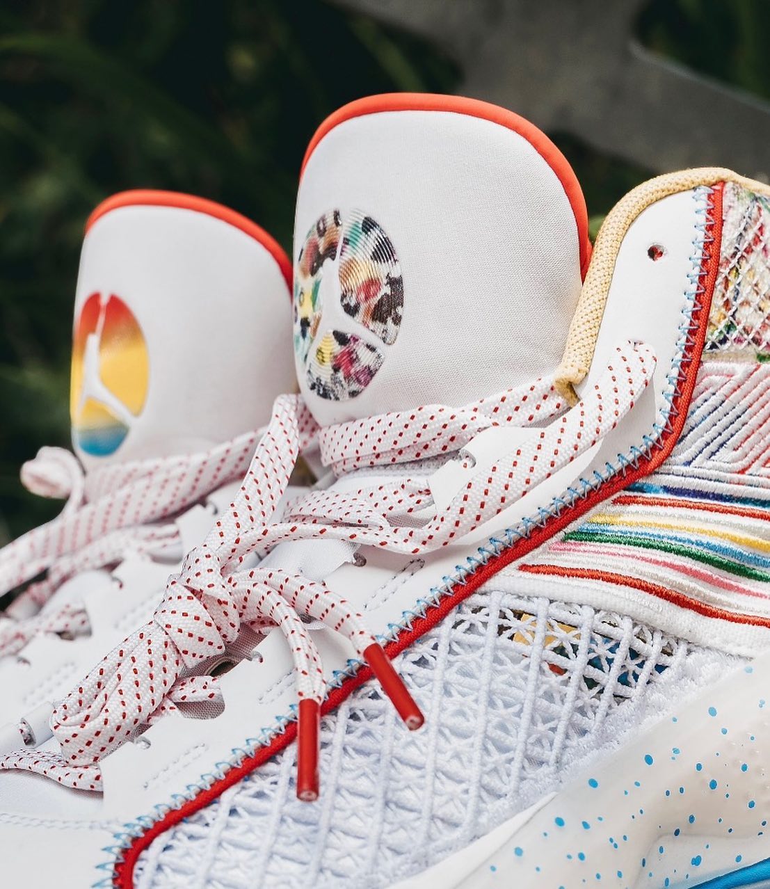 鞋舌鸳鸯造型的 Jumpman Logo 分别代表了洛杉矶的晚霞与孩子们五彩斑斓的世界。
