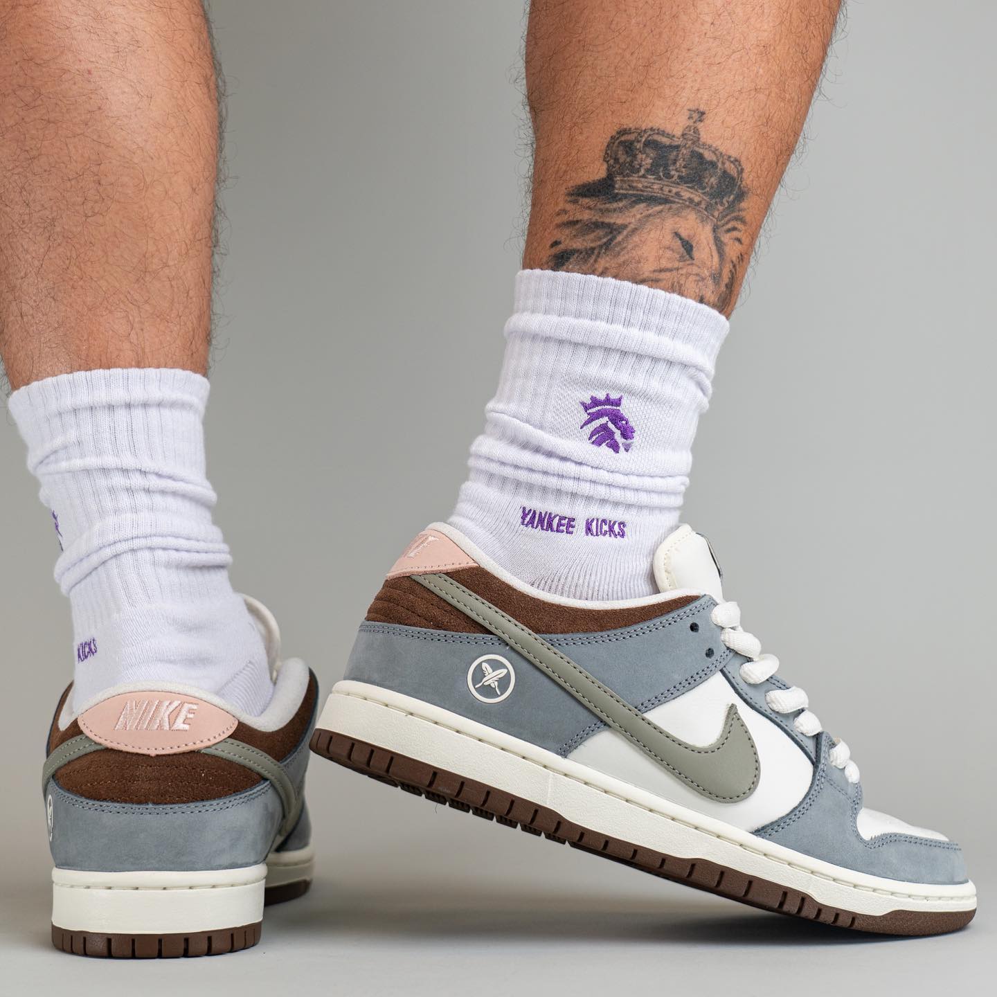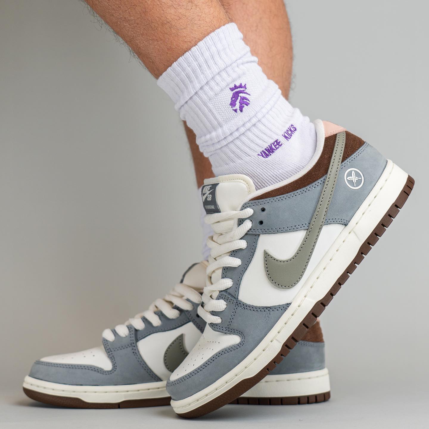 先说回球鞋,整体采用大面积白色皮革和灰色麂皮材质打造,搭配棕色 Swoosh 点缀,高级感满满。