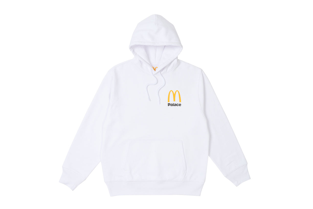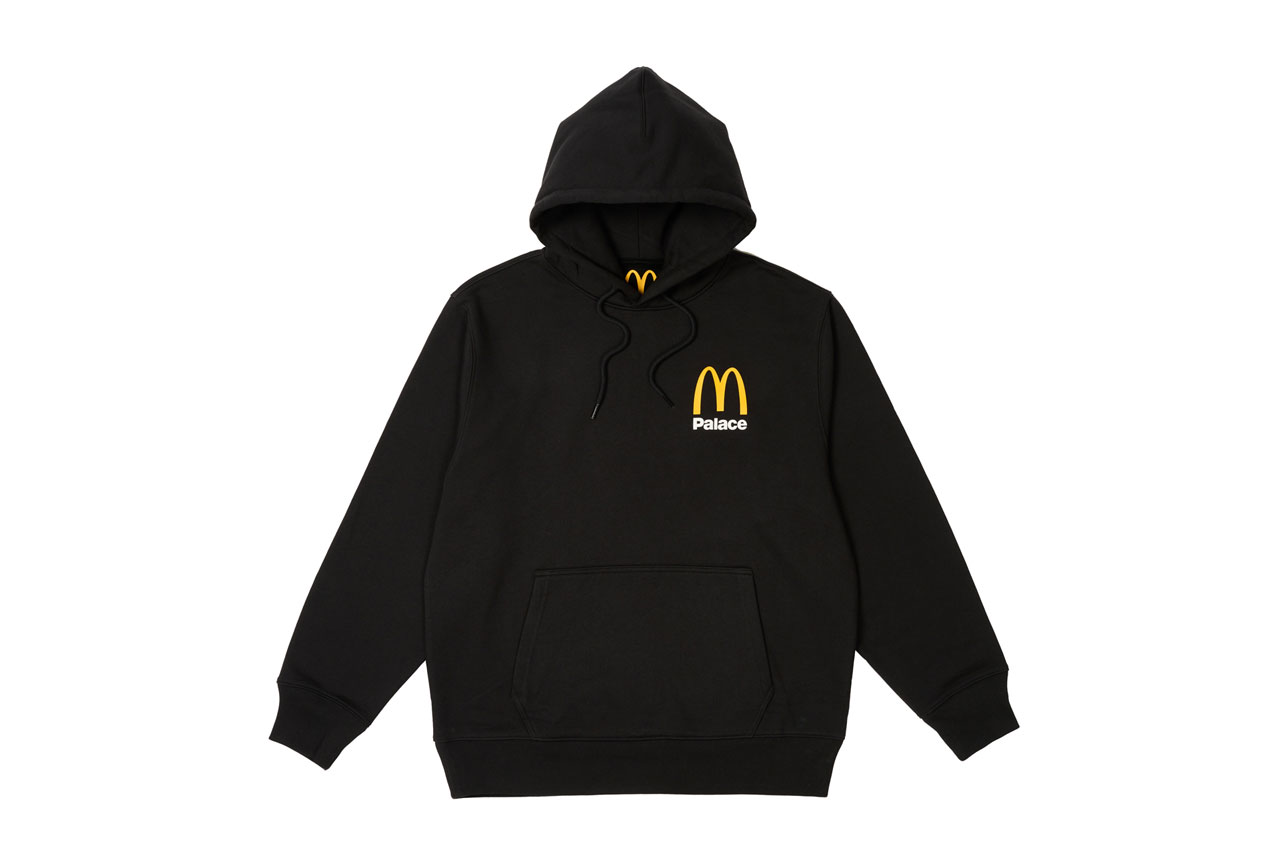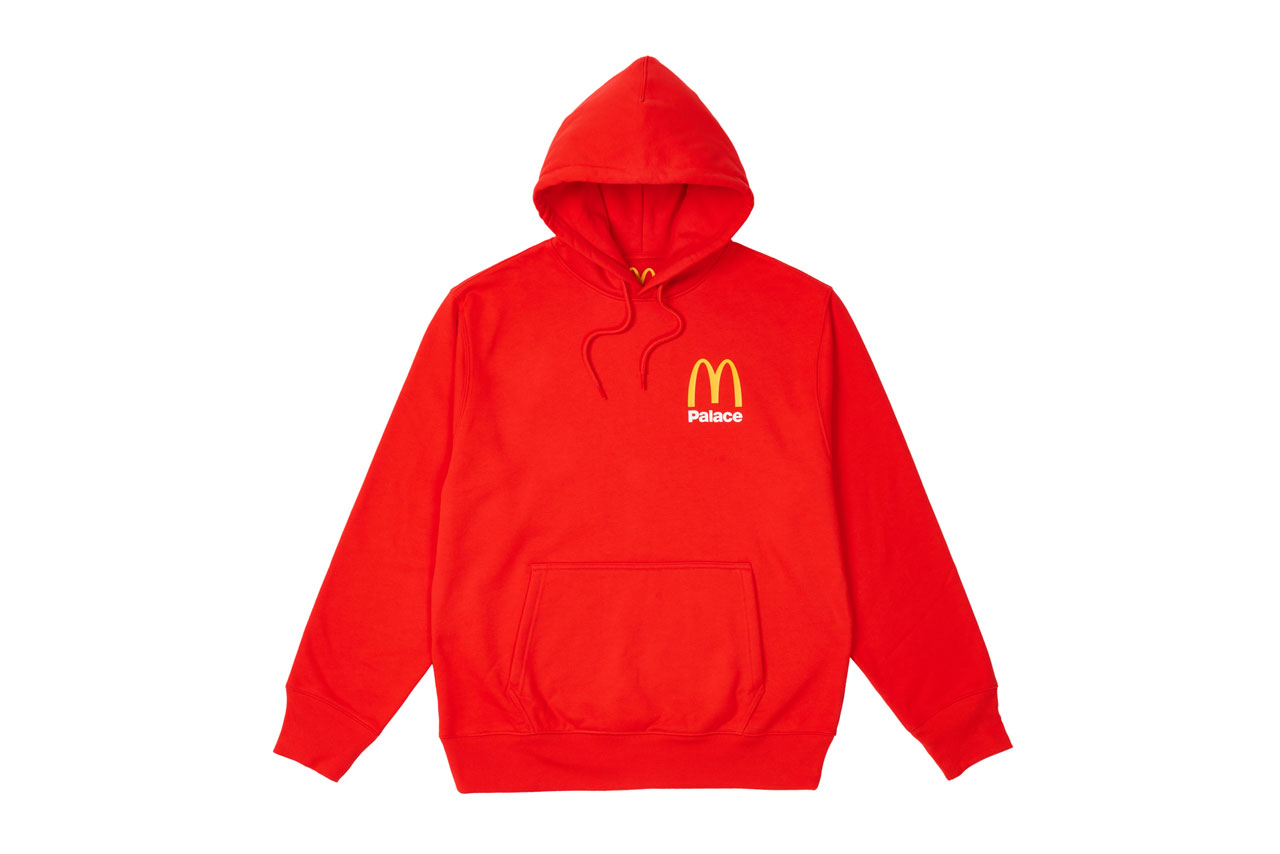 首先便是印有金拱门 Logo 和 PALACE 字样的短袖 T 恤、连帽卫衣,最直接的将联名身份彰显。