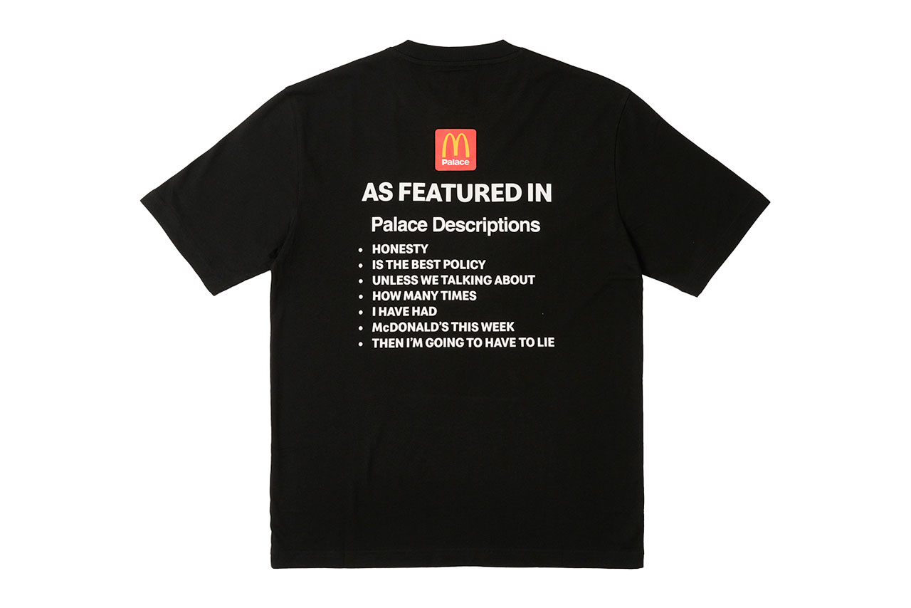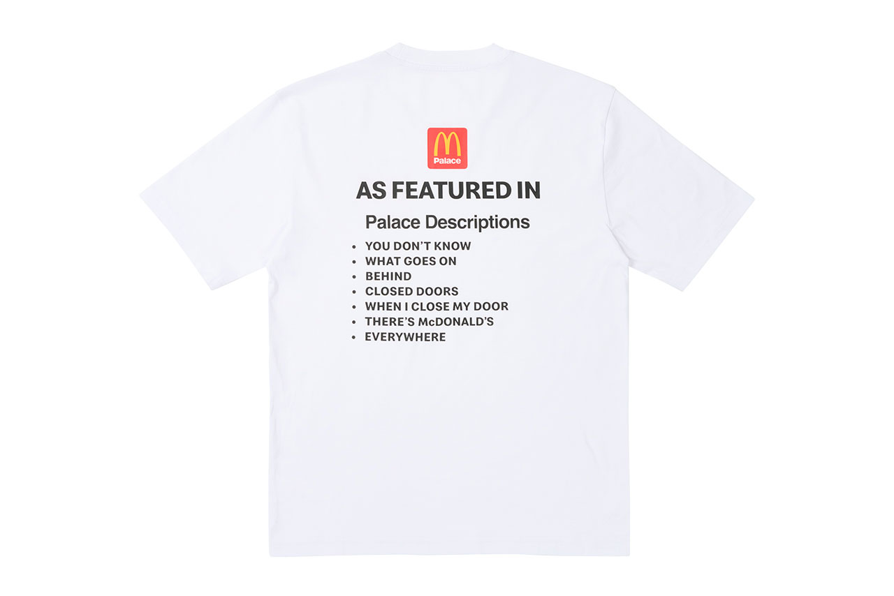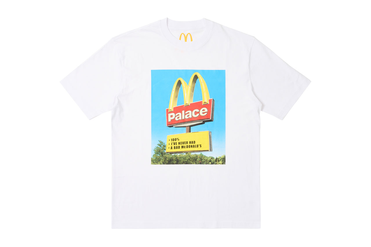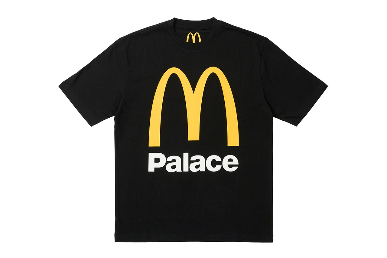 首先便是印有金拱门 Logo 和 PALACE 字样的短袖 T 恤、连帽卫衣,最直接的将联名身份彰显。