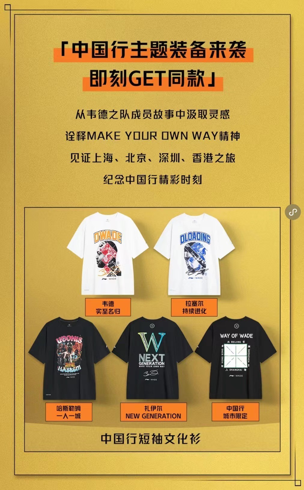先是韦德中国行的文化 T 恤共五款,目前现已上架,发售价格为 ¥298 元。