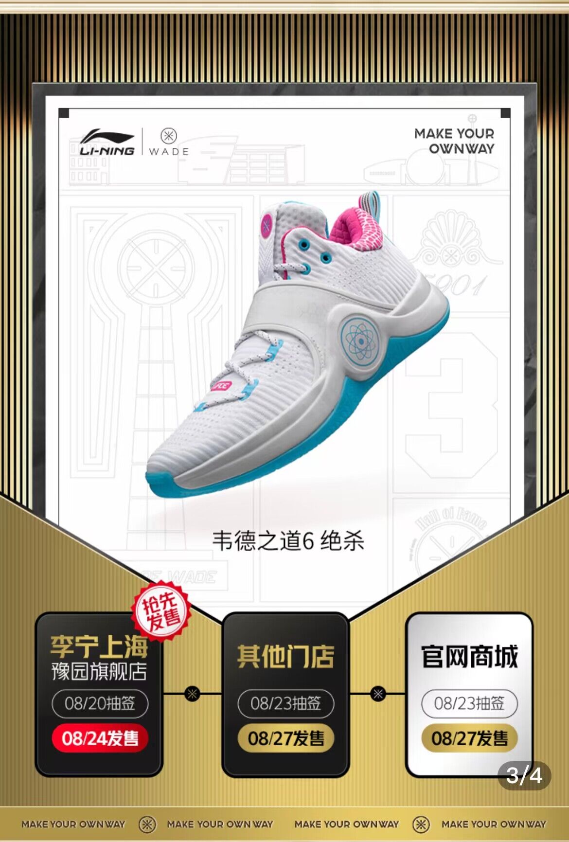 同时大家感兴趣的「韦德之道 6」绝杀配色同样开启登记,其中上海豫园旗舰店将于 8 月 20 日上午 10 点率先登记,8 月 23 日中午 12 点截止,具体中签消息大家可以多多关注李宁官方小程序。