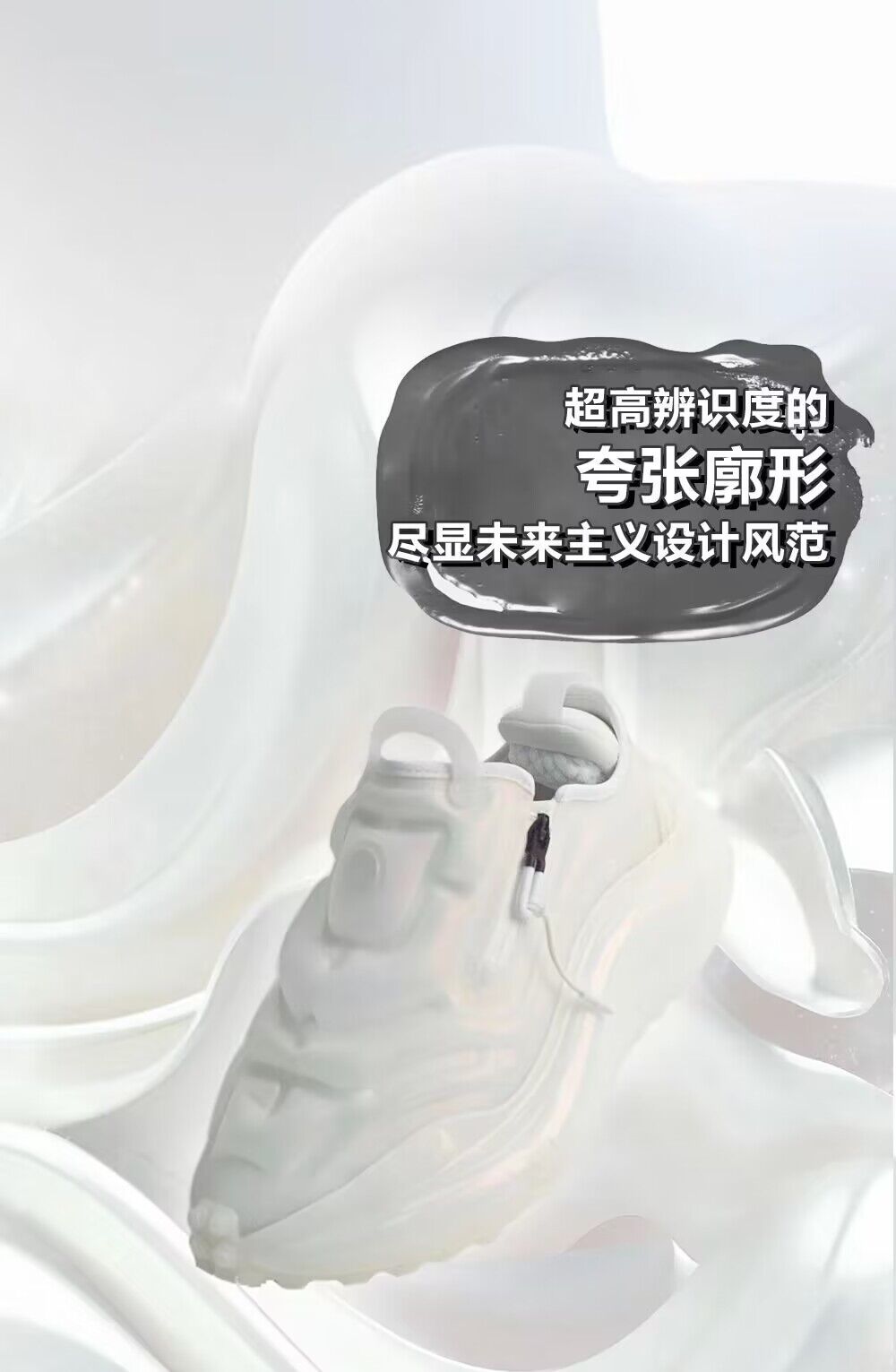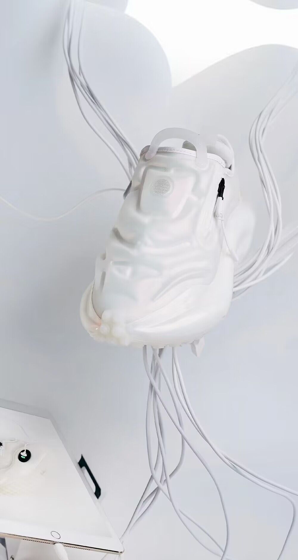 整双鞋采用纯白色一体式气囊覆面,内侧中底带有开关,可通过电机调节充气和放气,实现不同包裹层级的舒适穿着。