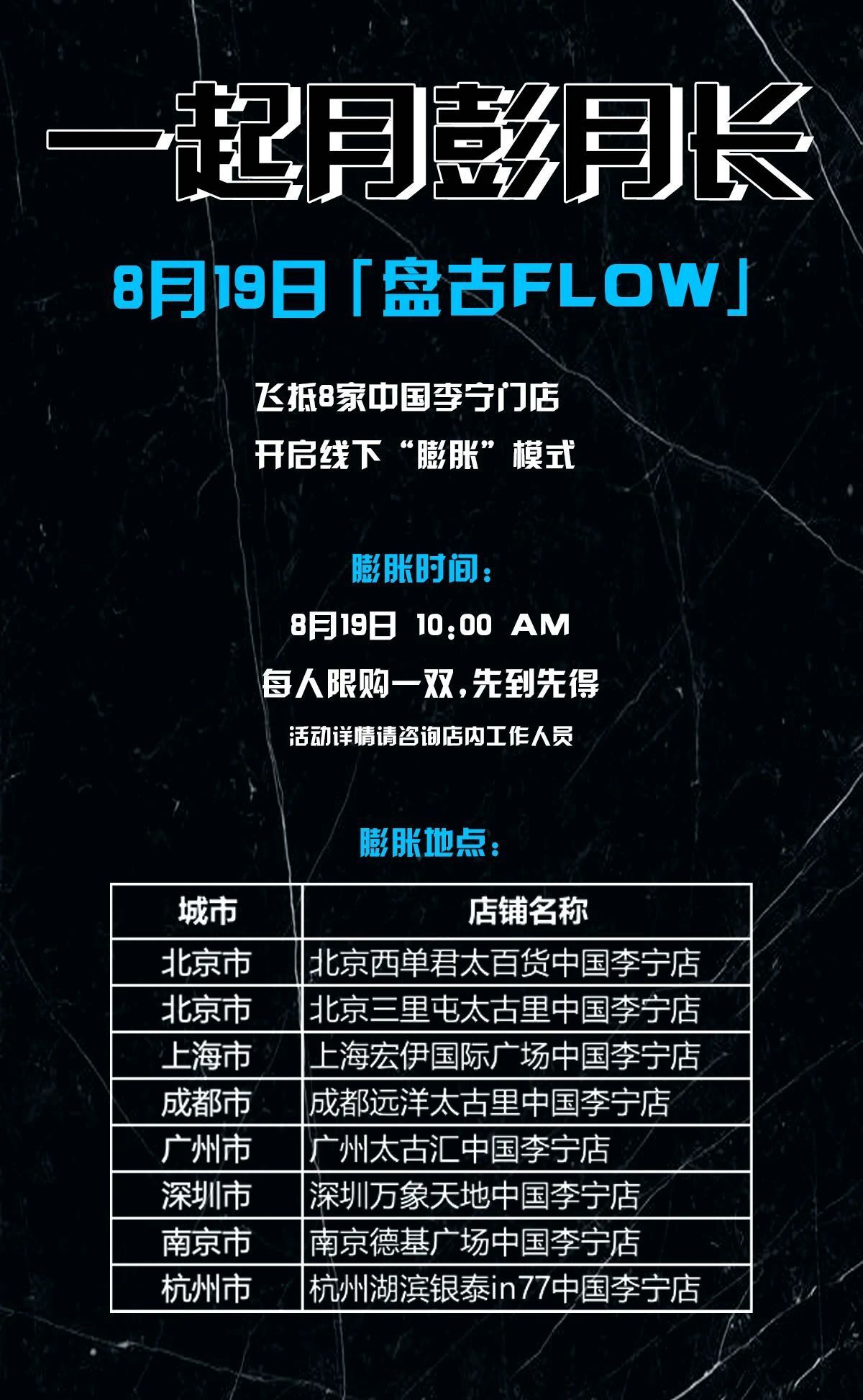 目前,盘古 FLOW 将于明天上午 10 点在 8 家李宁线下门店登场,先到先得。