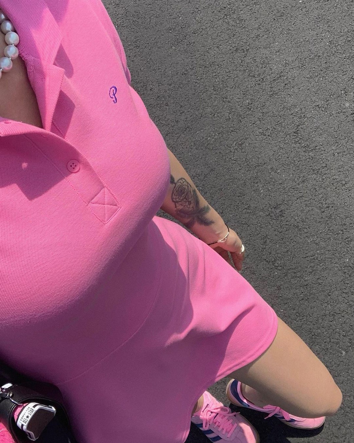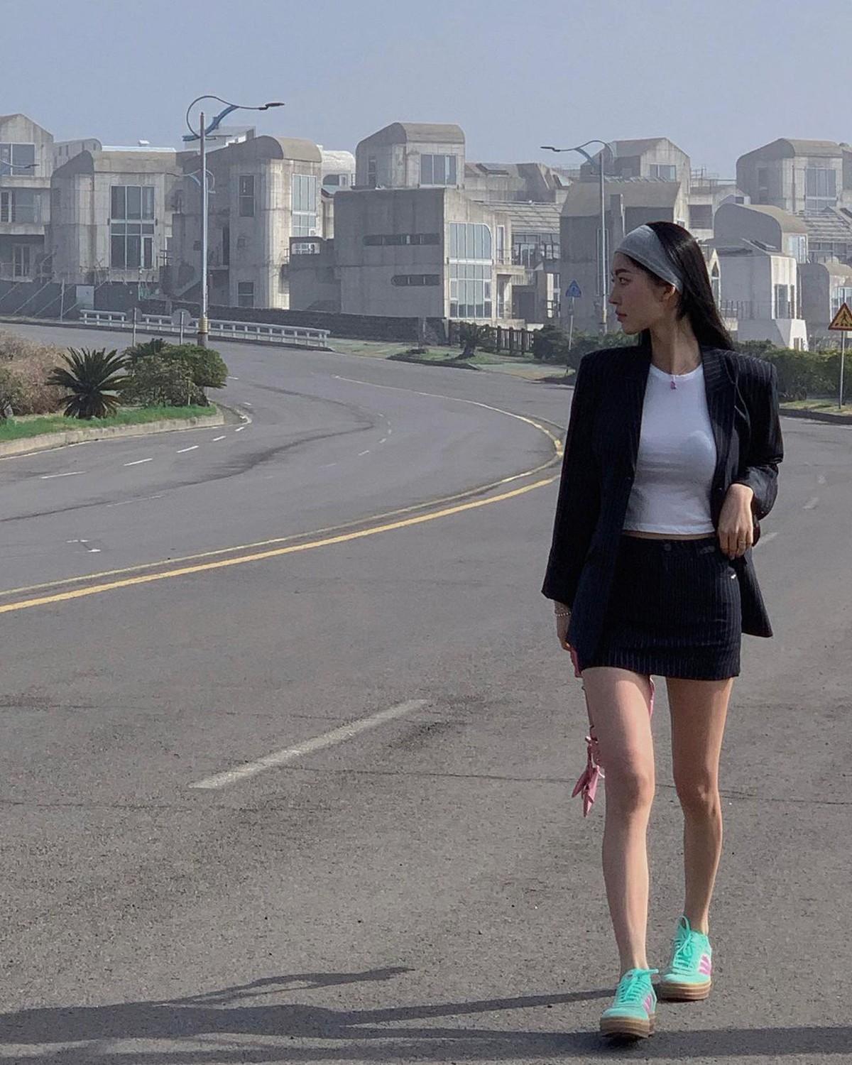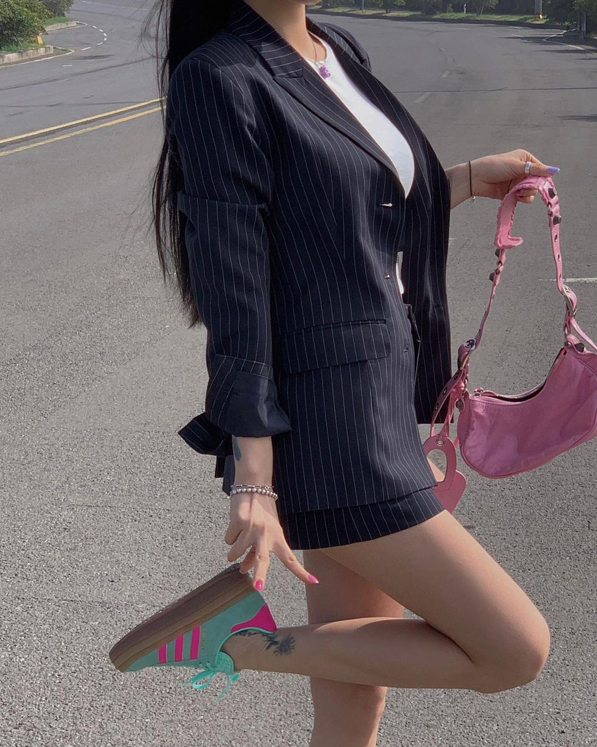 而近期她最爱的还得当属 adidas Originals Gazelle,不仅增高效果优秀,糖果色的甜美造型也非常契合当下流行的「多巴胺穿搭」。