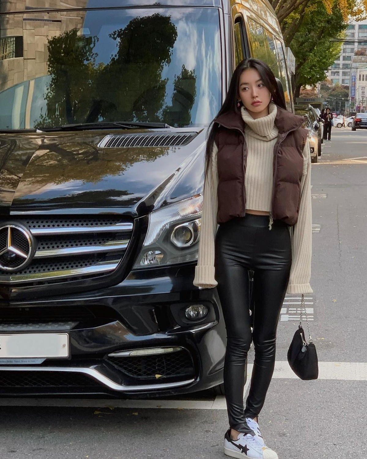 不仅如此,这高领毛衣 + 羽绒马甲 + 皮裤再踩上一双 BAPE® x adidas Originals Superstar,妥妥的韩剧女主既视感啊!