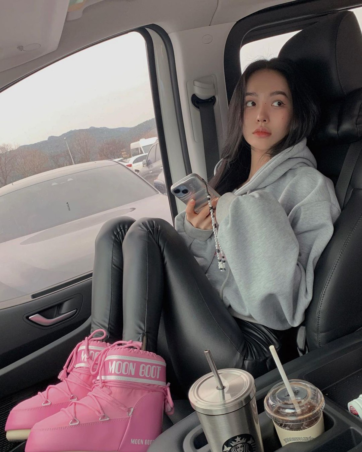 在车上还用长款 Legging 和克罗心经典长袜搭配 Nike Air More Uptempo Slide,这下我看看有谁说她是体育生穿搭!
