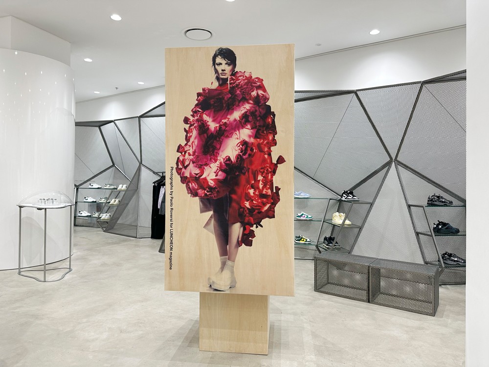 该装置由品牌创始人及设计师川久保玲(Rei Kawakubo)亲自操刀设计,并以最负盛名的摄影大师 Paolo Roversi 为 Luncheon Magazine 拍摄的一组照片为装置背景主题。