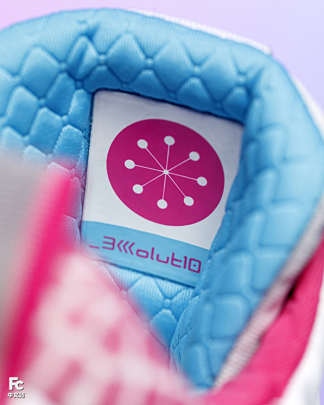 最后就是后跟提环,由元年的蓝粉双色改为了以灰色为主的造型,鞋帮处的粉色斑点则原汁原味地保留了下来。