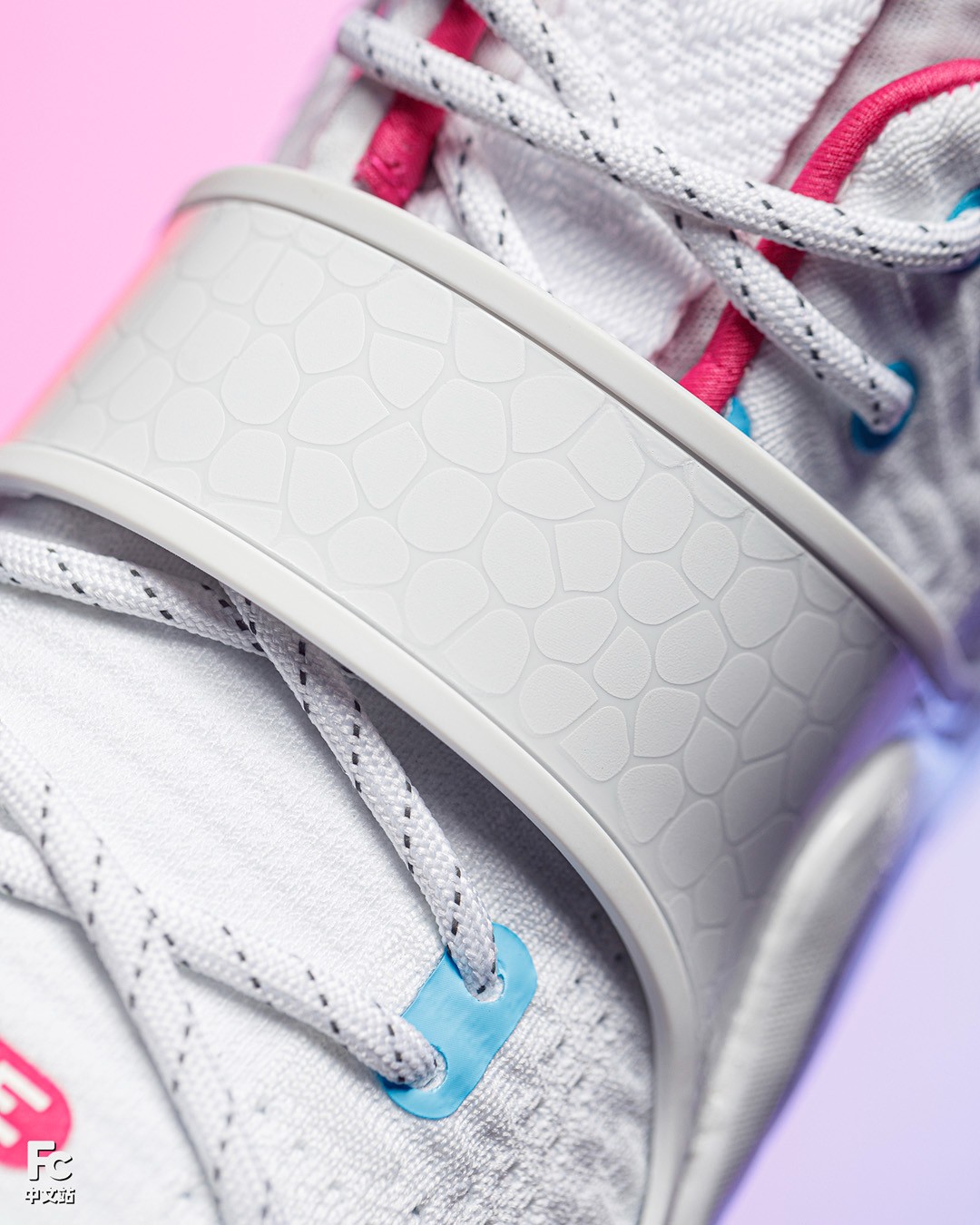 不难发现,这双 “绝杀” 配色的灵感,就是来自热火队那几年火到出圈的「罪恶都市」球衣,让蓝粉装扮成为了迈阿密独有的色彩符号。