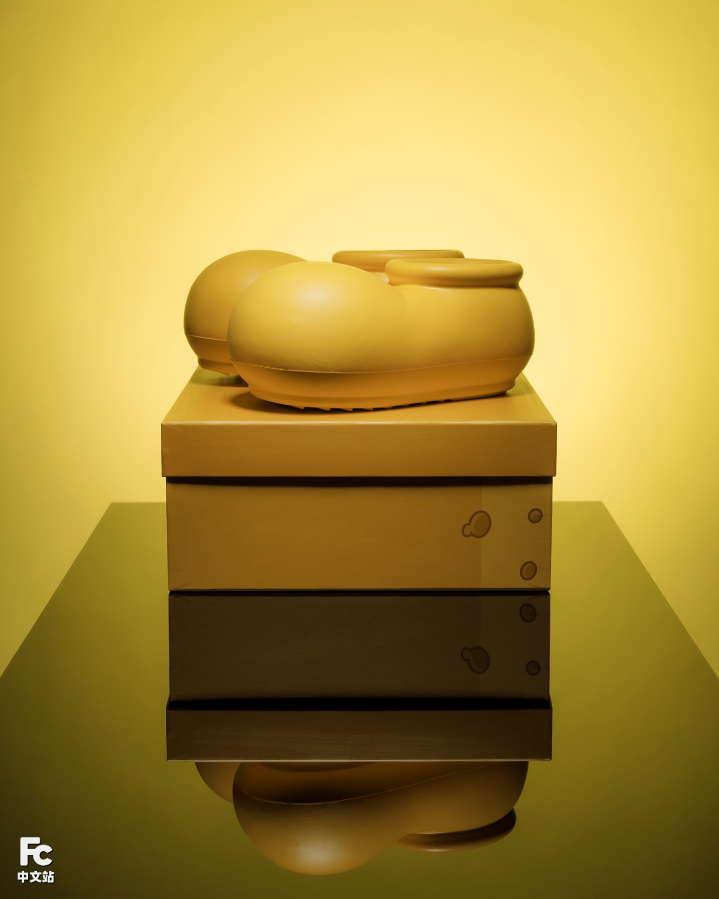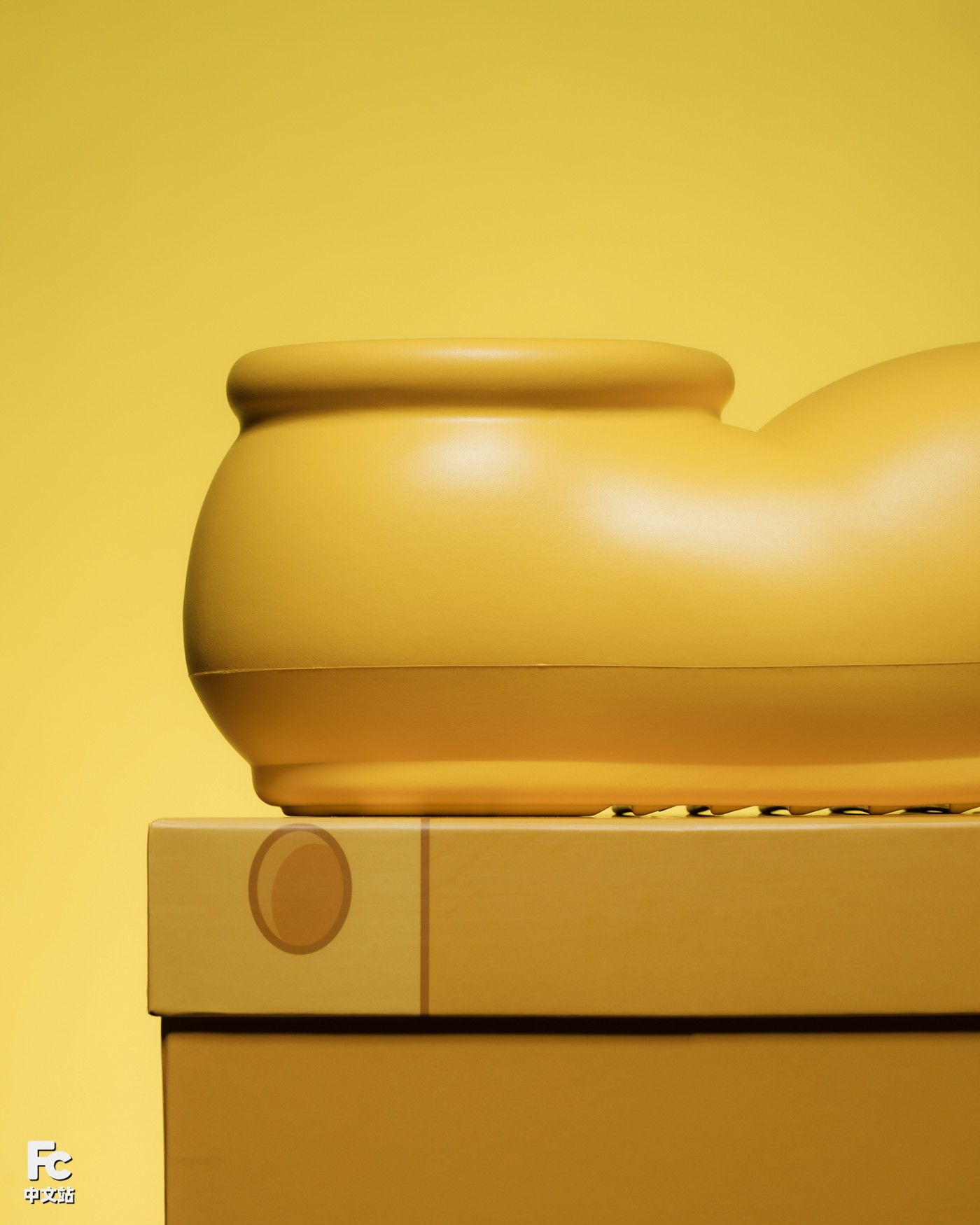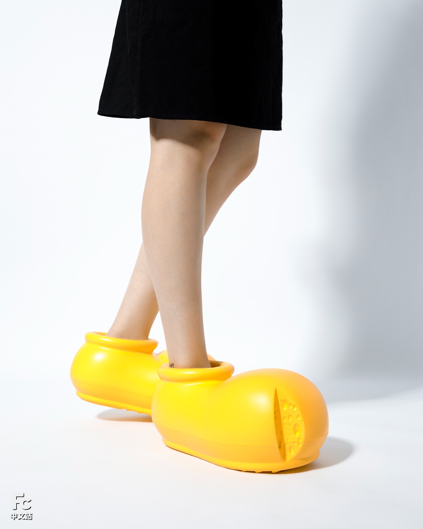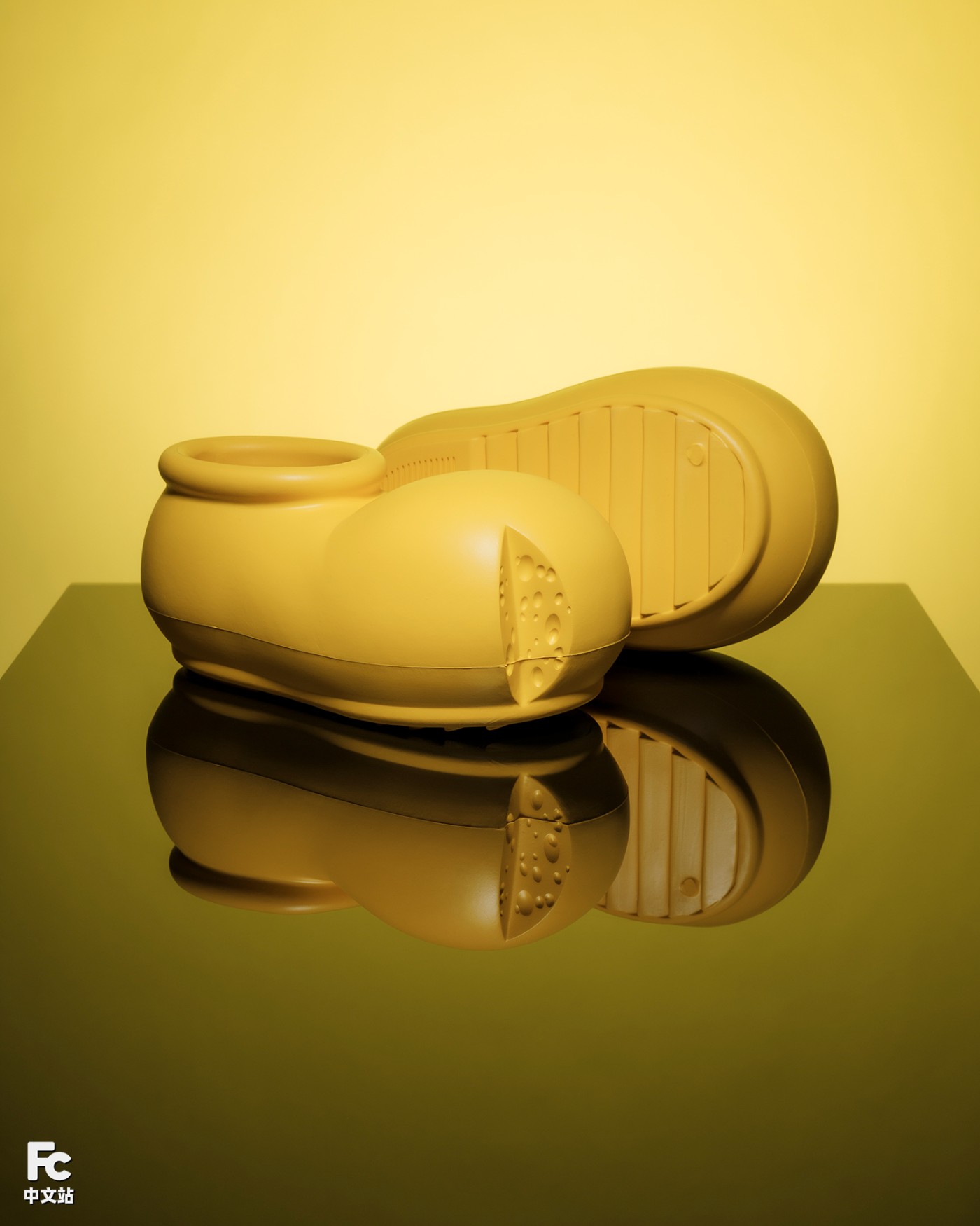 不同于大黄靴的高帮造型,「奶酪鞋」的低帮造型虽然也夸张,但依旧收敛很多。