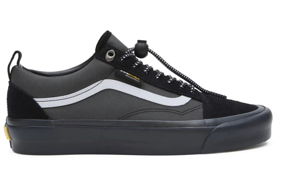 第一双以 Old Skool 为蓝本设计,采用纯黑色妆点,采用了防水耐磨的 CORDURA® 面料,同时搭配上抽绳设计,户外风十足。