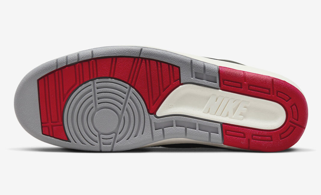 整双鞋大面积黑色为主调,细节部分点缀灰色红色,与经典的黑水泥造型如出一辙。