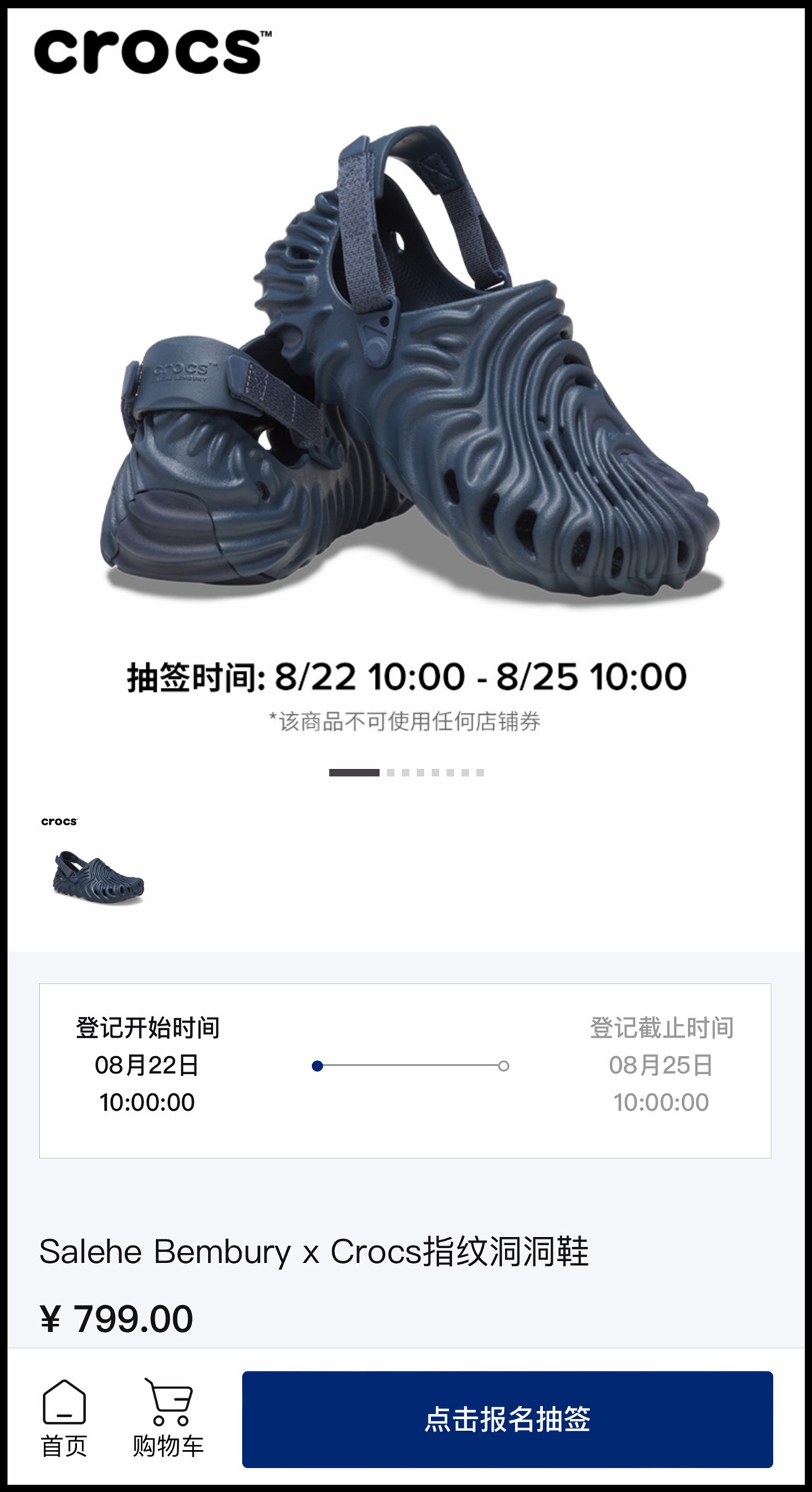 目前,全新配色 Salehe Bembury x Crocs 已经于 8 月 22 日 10:00 起在「Crocs 卡骆驰官方商城」微信小程序开启报名抽签,8 月 25 日本周五 10:00 截止。