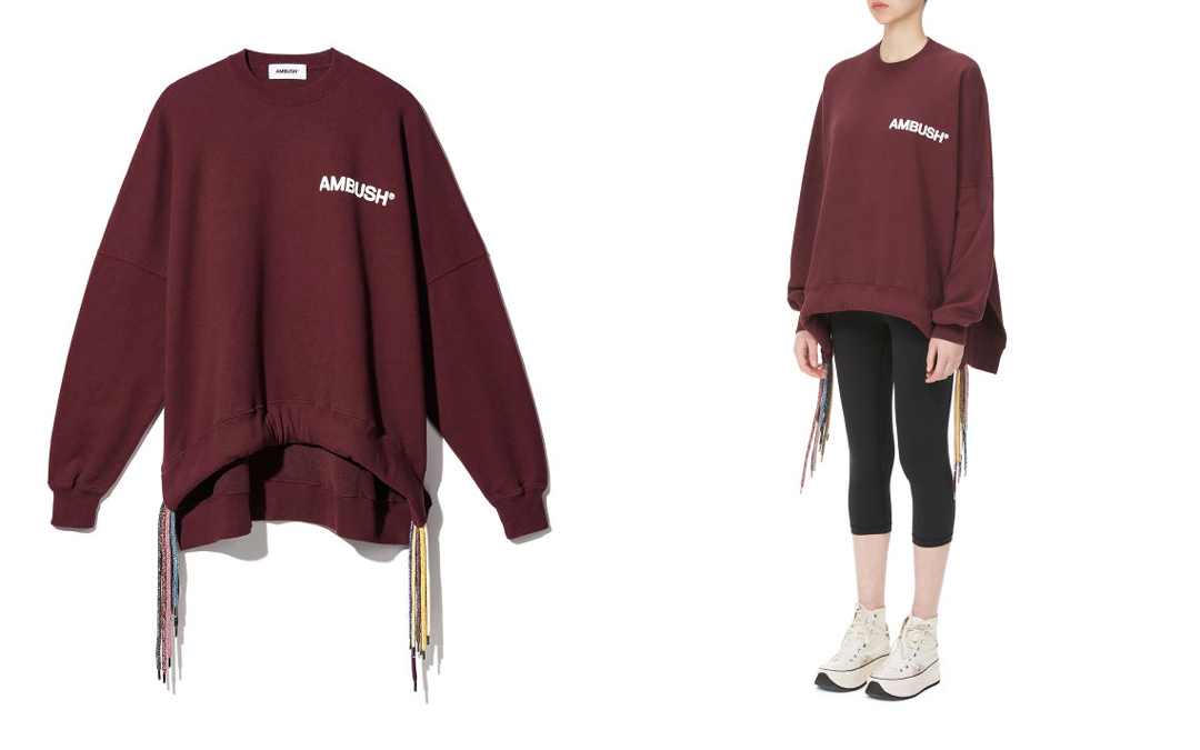 首先是卫衣,除了正面的 AMBUSH 字样外,两侧的抽绳设计更是 AMBUSH 最具代表性的设计之一,并且酒红色的造型对比其他颜色来说也不会太过醒目抢眼。
