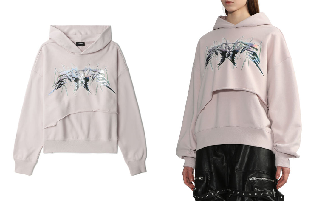 小编选择了一件带有破坏设计的连帽卫衣,浅粉红的配色方案加上电镀效果印花,使整件衣服不会过分乍眼却又暗藏闷骚。