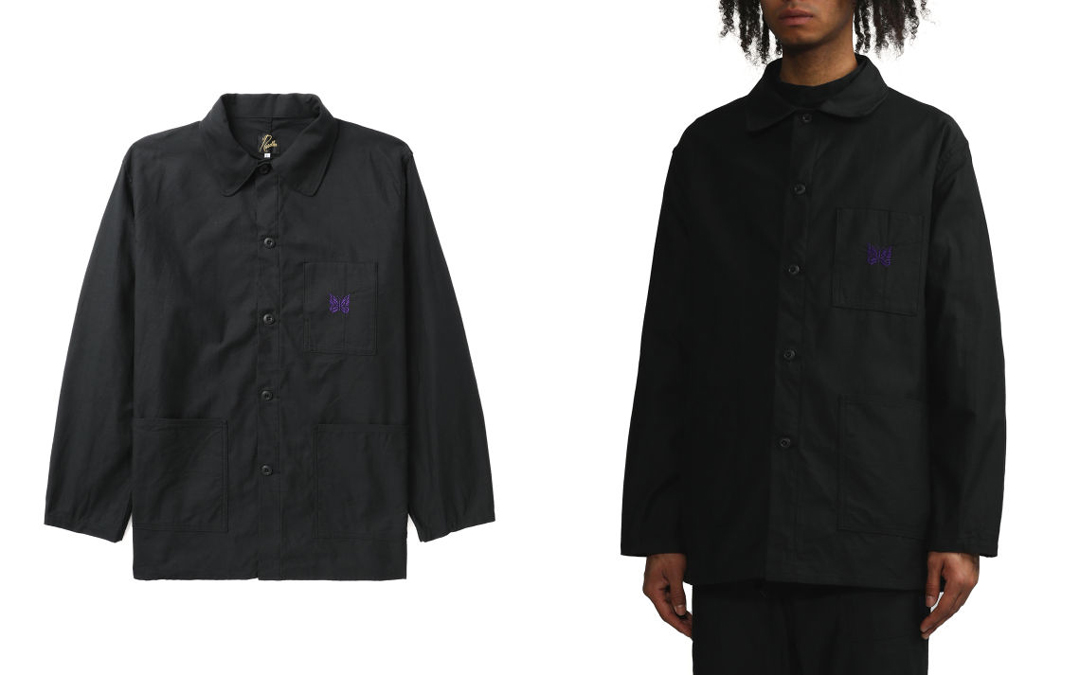 其次 NEEDLES 最具代表性的工装夹克也是囊括其中,纯黑色的外表在胸口处印有紫色蝴蝶 Logo,既彰显了品牌身份,更为原本过分简约的造型增添一抹颜色。