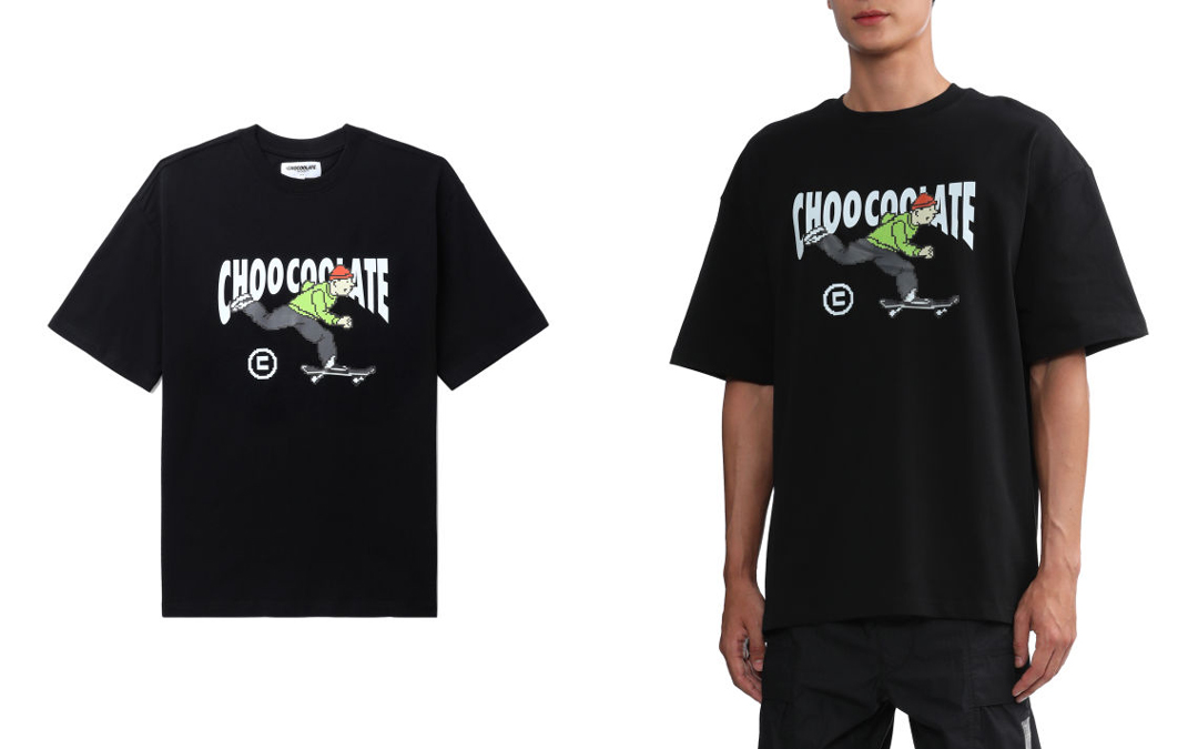 黑色的 T 恤在正面印有 CHOCOOLATE 字样和一个像素级别的板仔,将街头气质尽显。