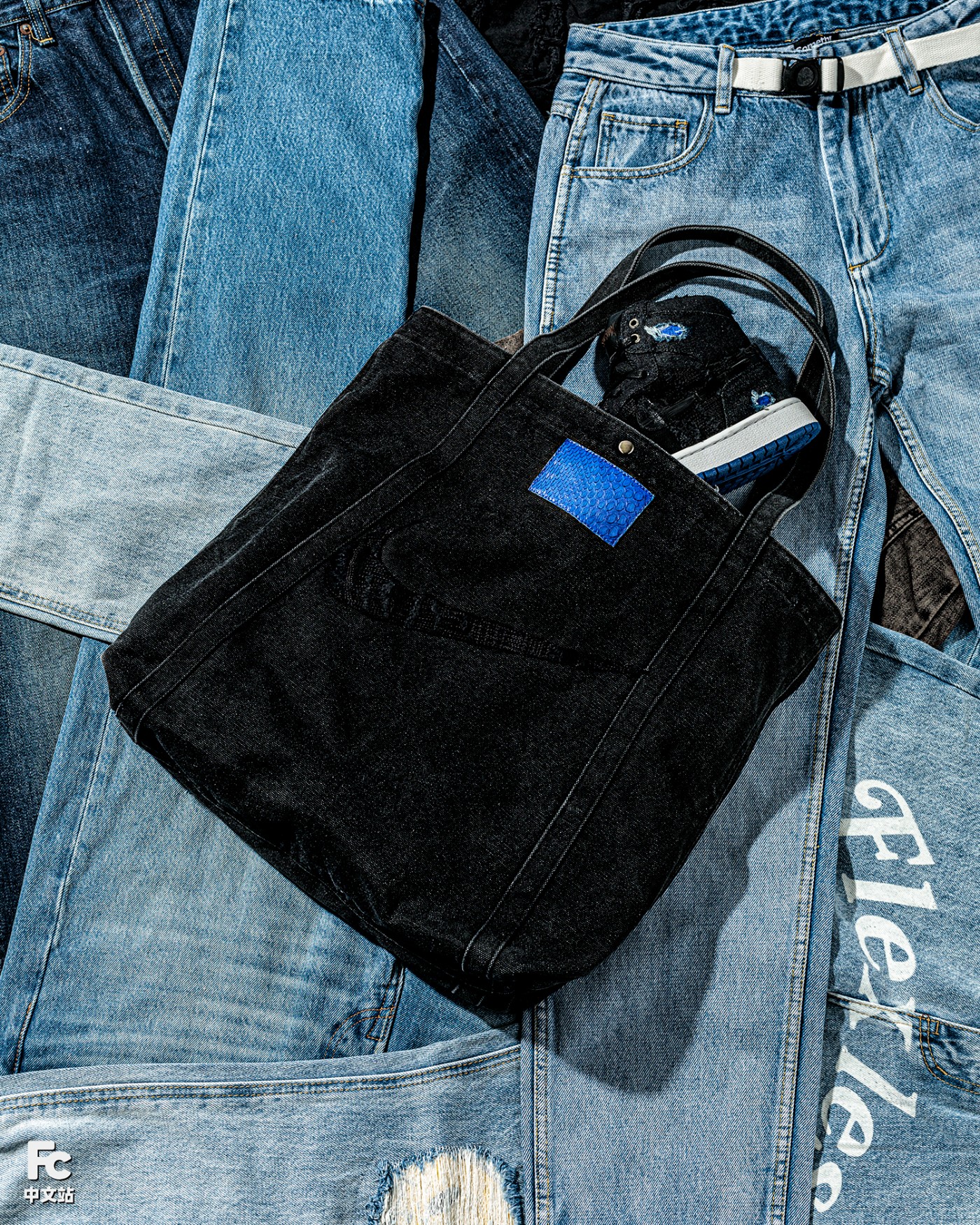 本次还附赠一个同样由中古牛王「85 牛」重新拆解打造,同时还缝有蓝色蛇皮材质的托特包,非常适合搭配出街。