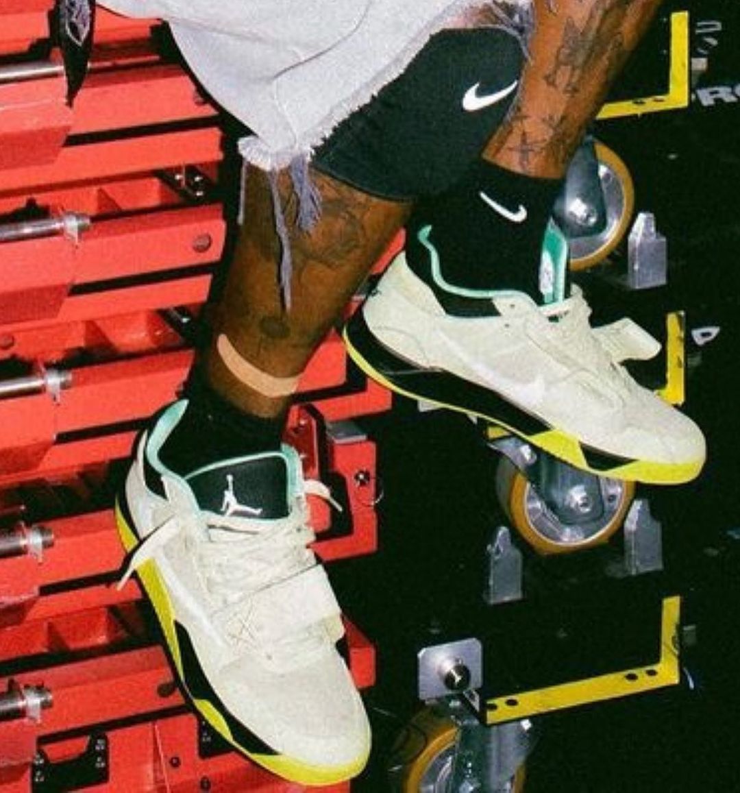 脚上乍看应该还是全新配色 Travis Scott x Jordan Cut The Check,但在随后的图中,可以确定这双鞋并不是之前曝光的那双。