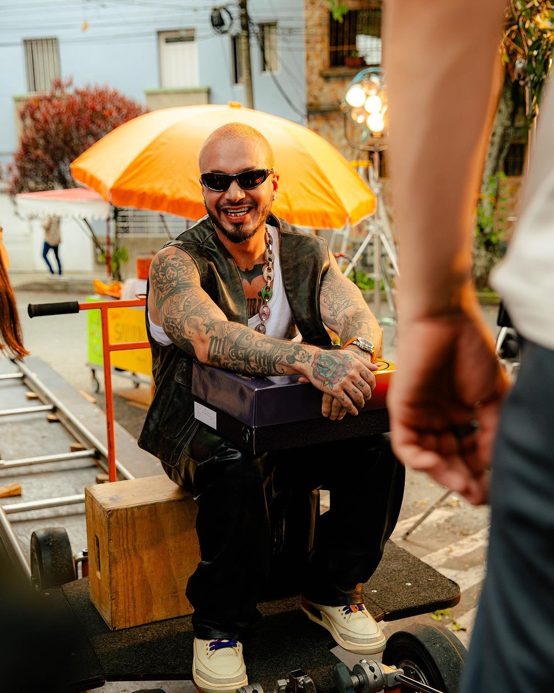 J Balvin 上脚这双鞋的时候还特意换上了蓝色鞋带,手里抱着特殊设计的鞋盒。