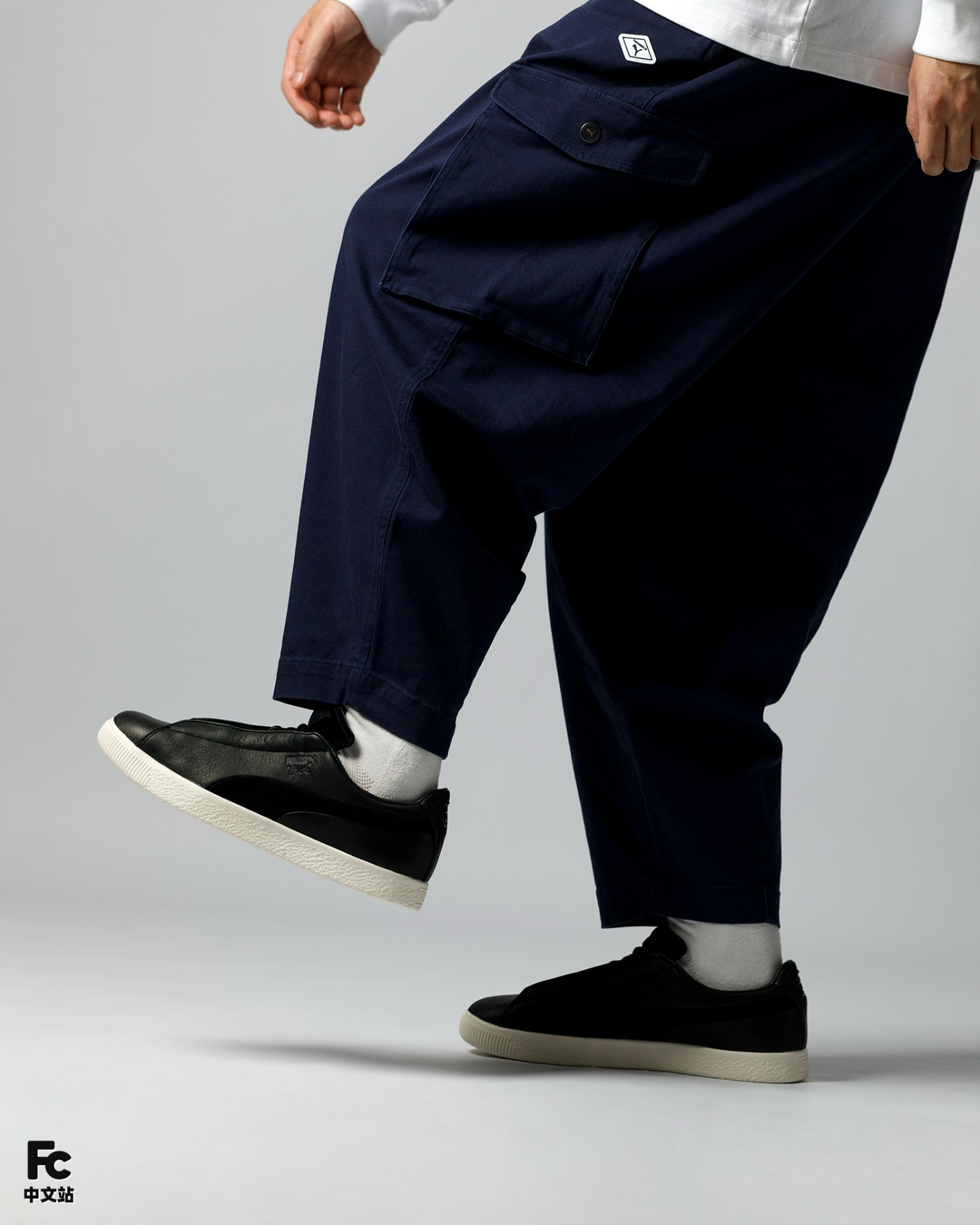来到上脚环节,小编选择了 PUMA x NANAMICA 裤装,上宽下窄的九分裤多了一丝休闲感。