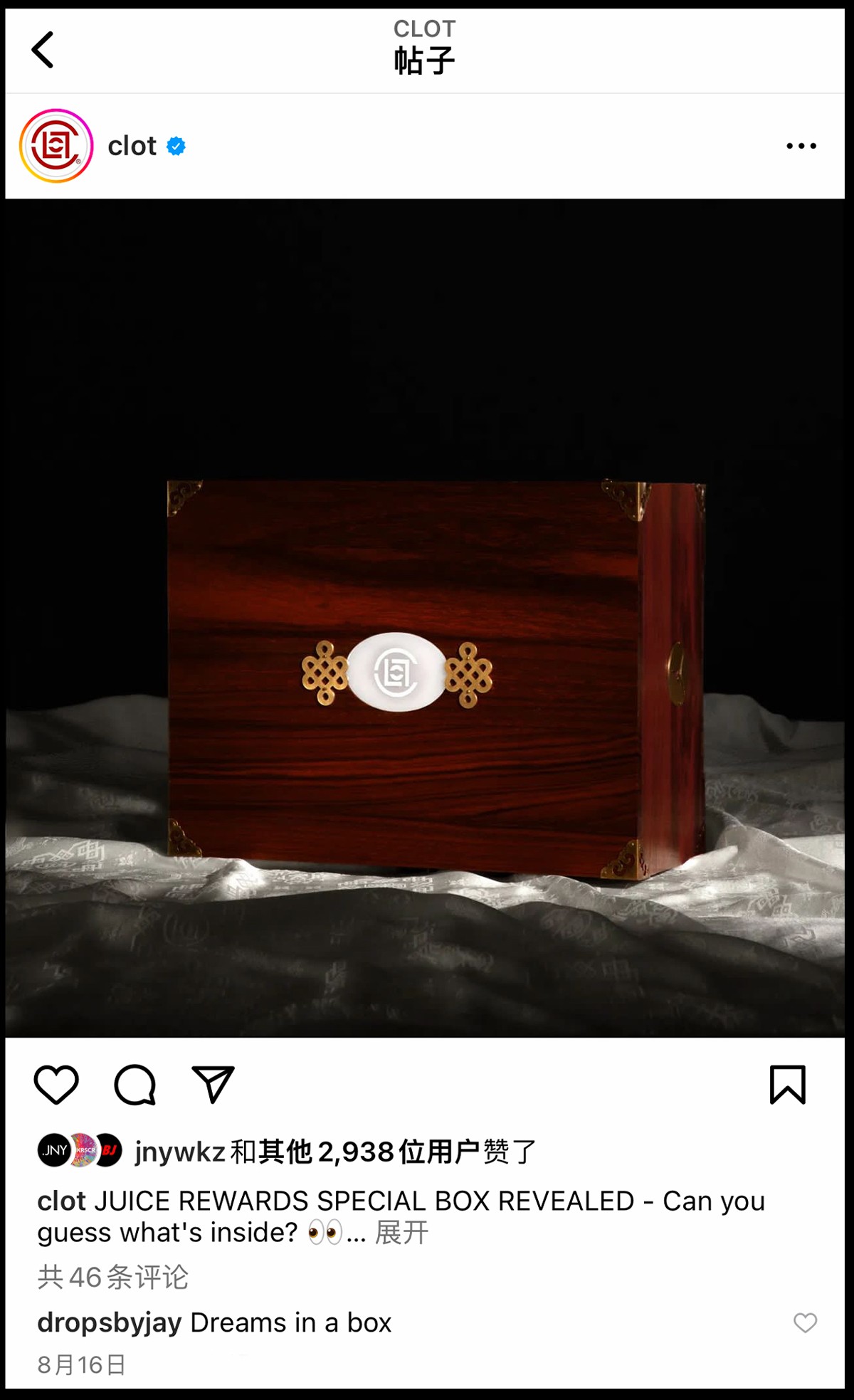 随着时间的推移,8 月中旬 CLOT 晒出了一只硕大木质球鞋礼盒,并在身边辅以 Jumpman Logo 和白丝绸布料点缀,引得无数玩家猜忌。