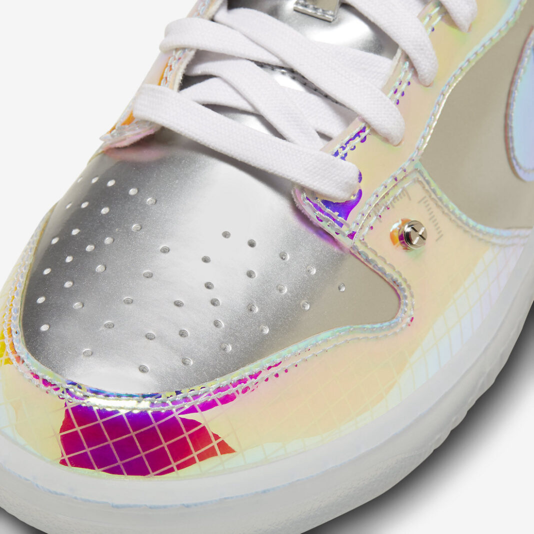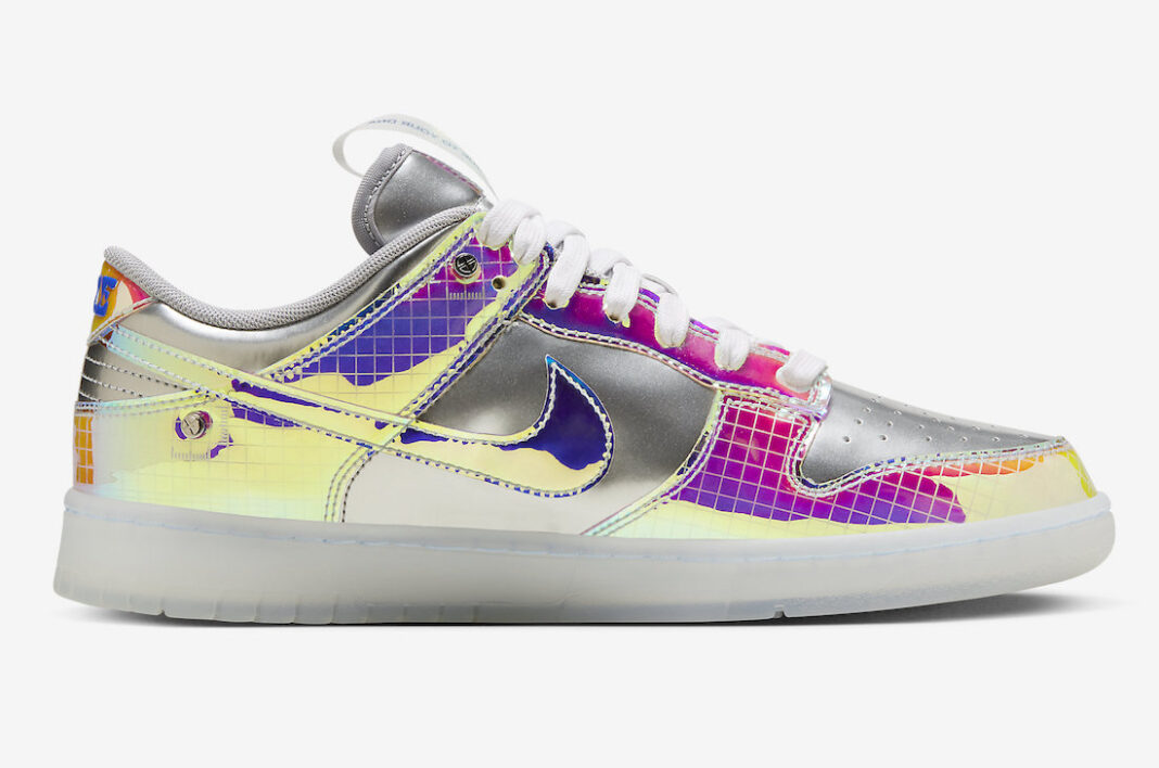 这阵子 Dunk 系列的配色一双比一双抢眼,昨天飞天小女警 x Dunk SB 的实物全员到齐。 最近一双全新 Nike Dunk Low “Be True” 释出官图。 相信大家看到这双鞋的第一眼一定会说太骚气了! 不仅是配色花哨,材质运用也相当大胆,组合在一起看着格外梦幻。 除了配色、材质,细节设计同样可圈可点。 比如,鞋舌位置额外添加的织带以及后跟全新设计的花体 Nike 字样,都让人眼前一亮。