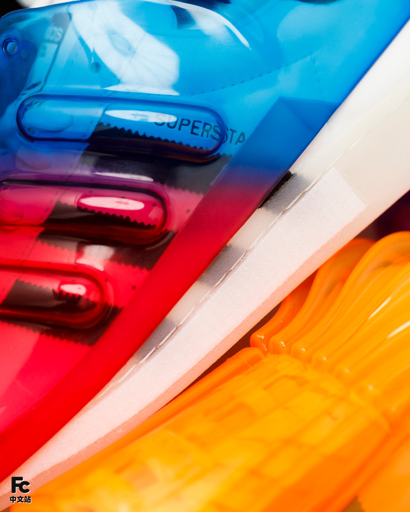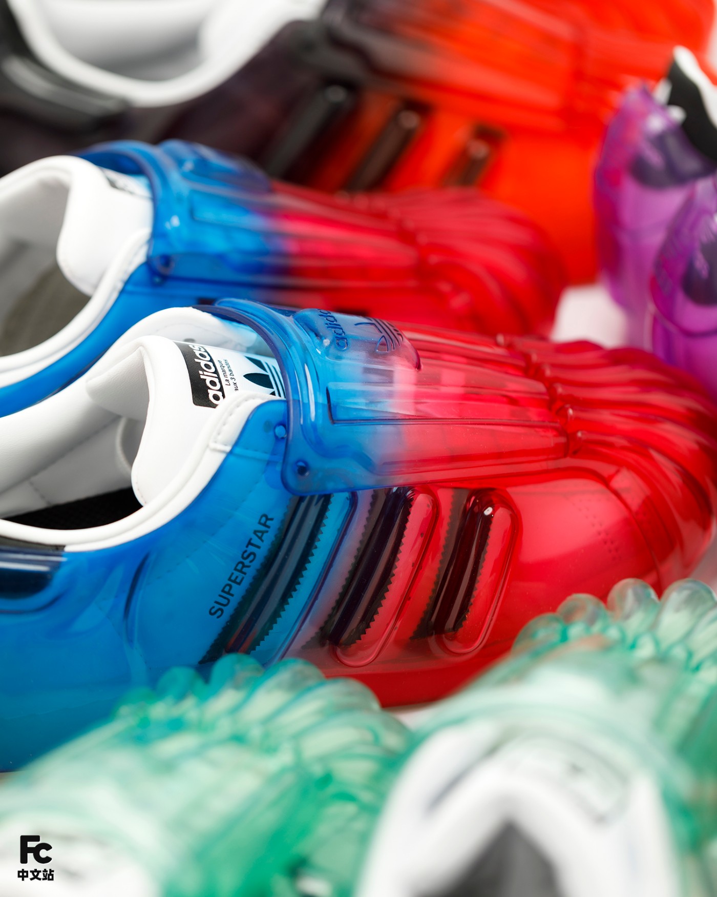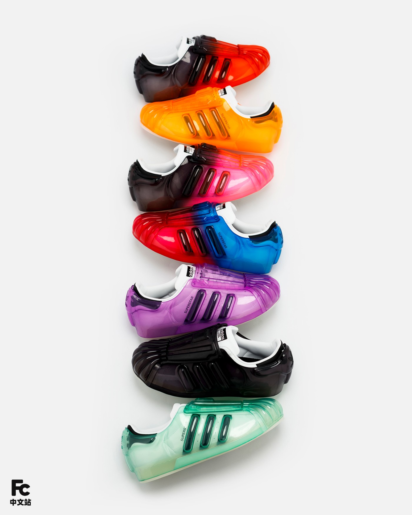 首先最有意思的就是基于 OG 款 Superstar 为核心,通过追加半透明果冻彩色外壳的形式,带来前所未见的新颖造型。